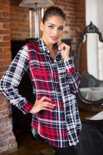 Туника Миа-Миа домашняя женская длиной ниже колена, полуприлегающего силуэта из принтованной вискозы, с отложным воротником. Воротник рубашечного типа. Туника застегивается на пуговицы и подвязывается поясом.