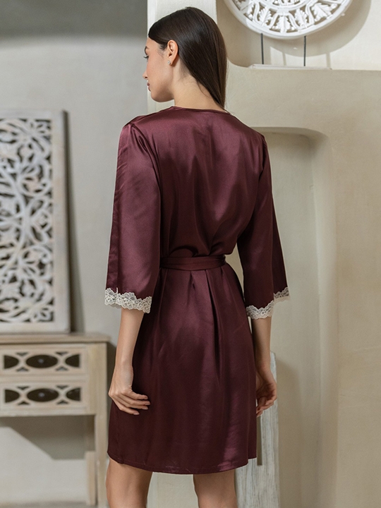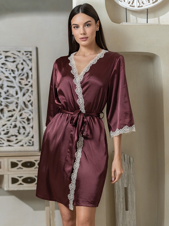 Винный L/XL Короткий халат Mia-Sofia с рукавами 3/4 выполнен из искусственного шелкового полотна с атласным блеском. Рукава и борта халата декорированы изящным кружевом. Халат на запахе с поясом, в боковых швах есть карманы. 100% полиэстер
