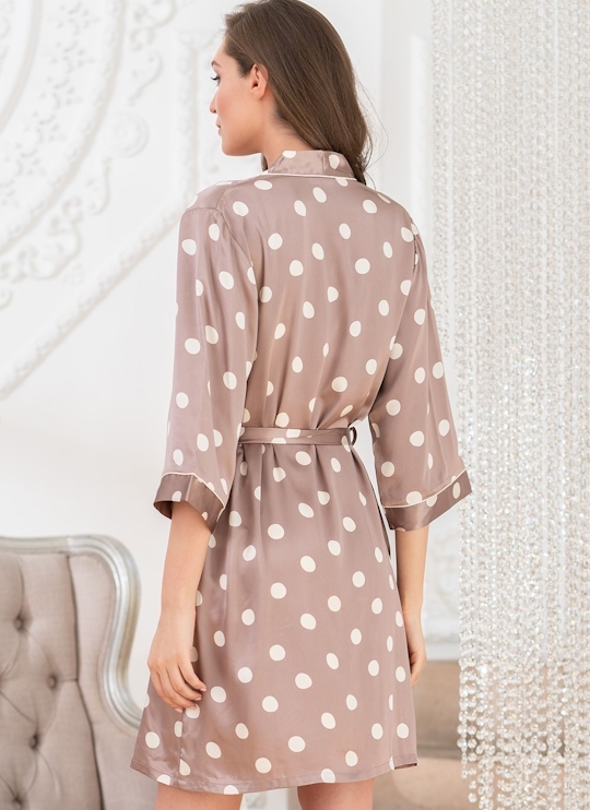 Кофейный L/XL Короткий халат Mia-Mella с рукавами 3/4 выполнен из принтованного искусственного шелкового полотна с атласным блеском. Низ рукавов и борт халата декорированы контрастным кантом. Халат на запахе с поясом, в боковых швах есть карманы. Коллекция "Julia latte". 100% полиэстер