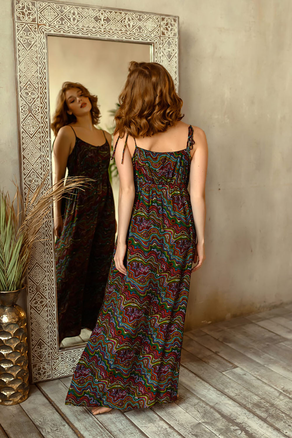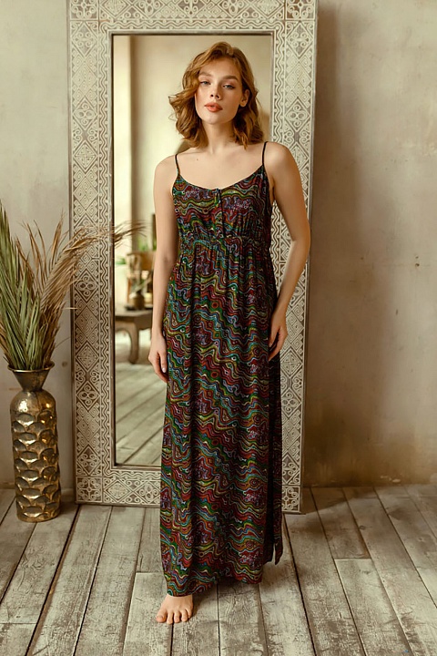 Платье прямого силуэта выполнен из вискозы с фантазийным принтом. Лиф отрезной, чуть выше  линии талии на эластичной тесьме "резинке". Спереди планка на 4-х пуговицах и петлях. Тонкие бретели позволяют регулировать высоту лифа данной модели.