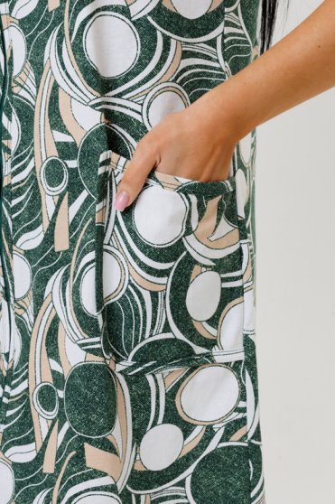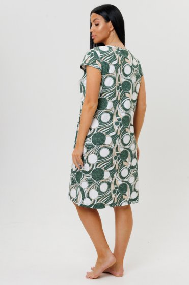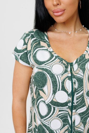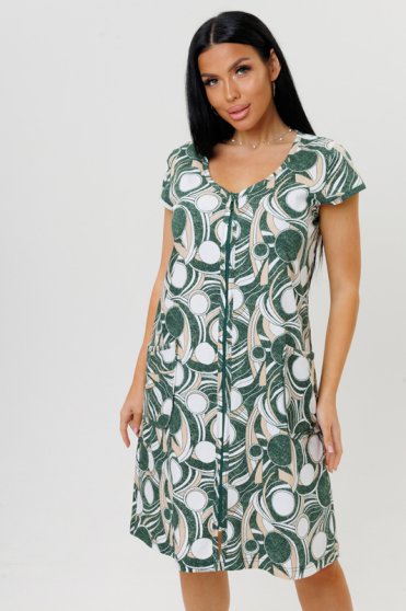 Оптовая продажа. Халат женский из трикотажного полотна кулирная гладь с геометрическим рисунком по всему полотну, прямого кроя, приталенного силуэта, с короткими укороченными рукавами, округлым вырезом горловины, глубокими накладными карманами. Изделия из натурального хлопка подходят для чувствительной кожи, летнего и зимнего периода, они дышащие и легкие.