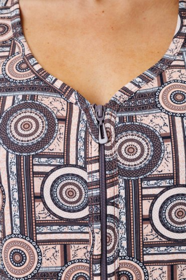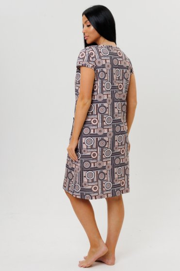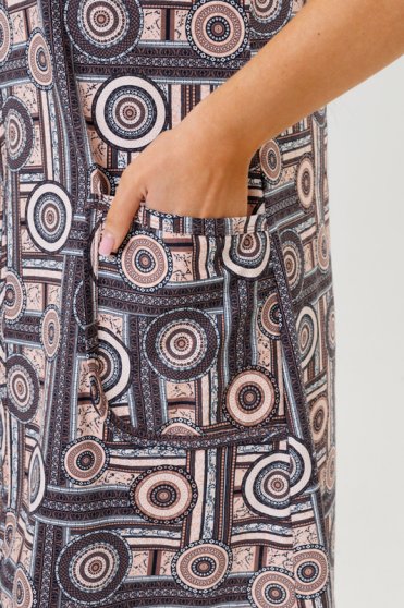 Оптовая продажа. Халат женский из трикотажного полотна кулирная гладь с геометрическим рисунком по всему полотну, прямого кроя, приталенного силуэта, с короткими укороченными рукавами, округлым вырезом горловины, глубокими накладными карманами. Изделия из натурального хлопка подходят для чувствительной кожи, летнего и зимнего периода, они дышащие и легкие.