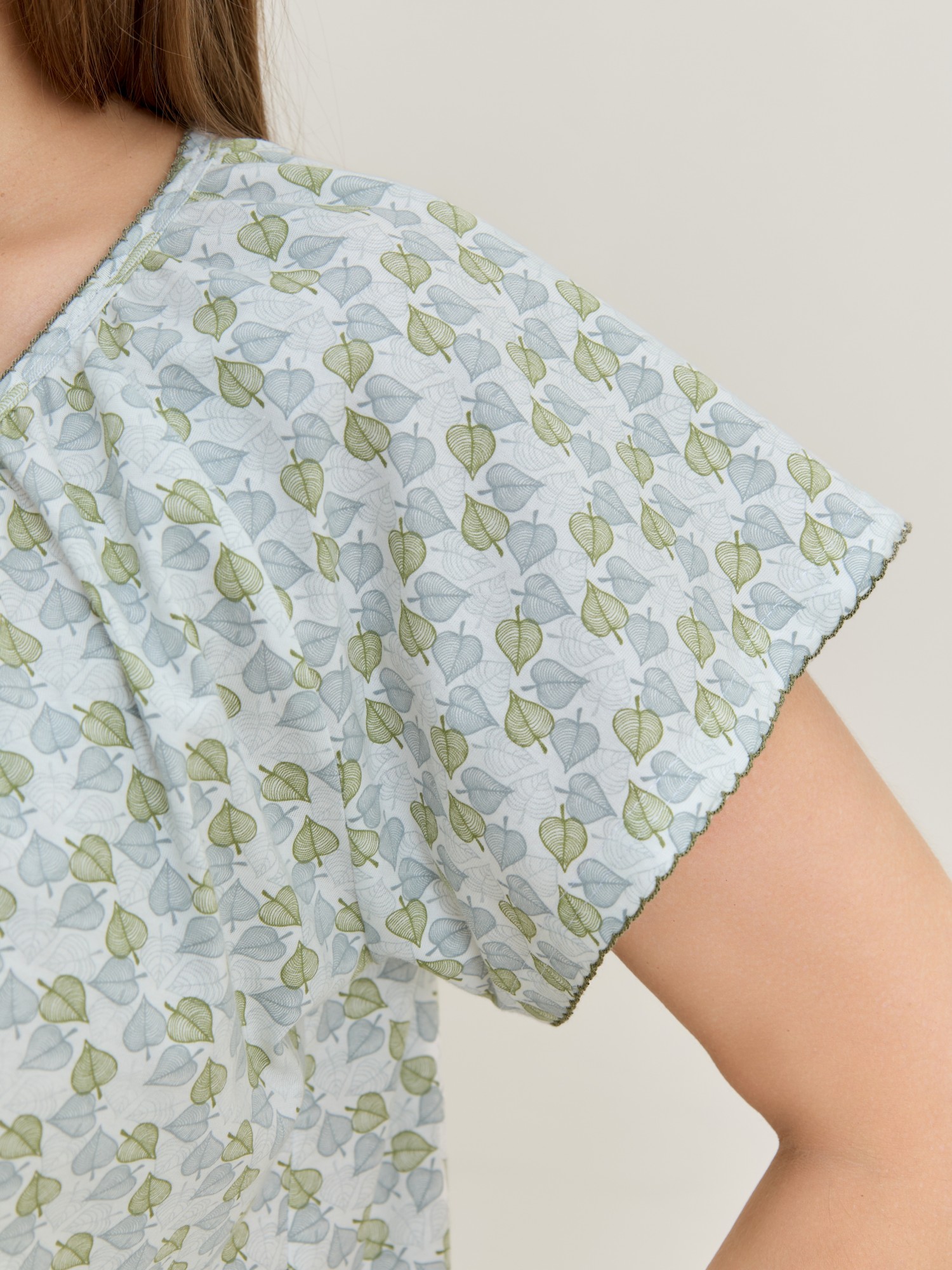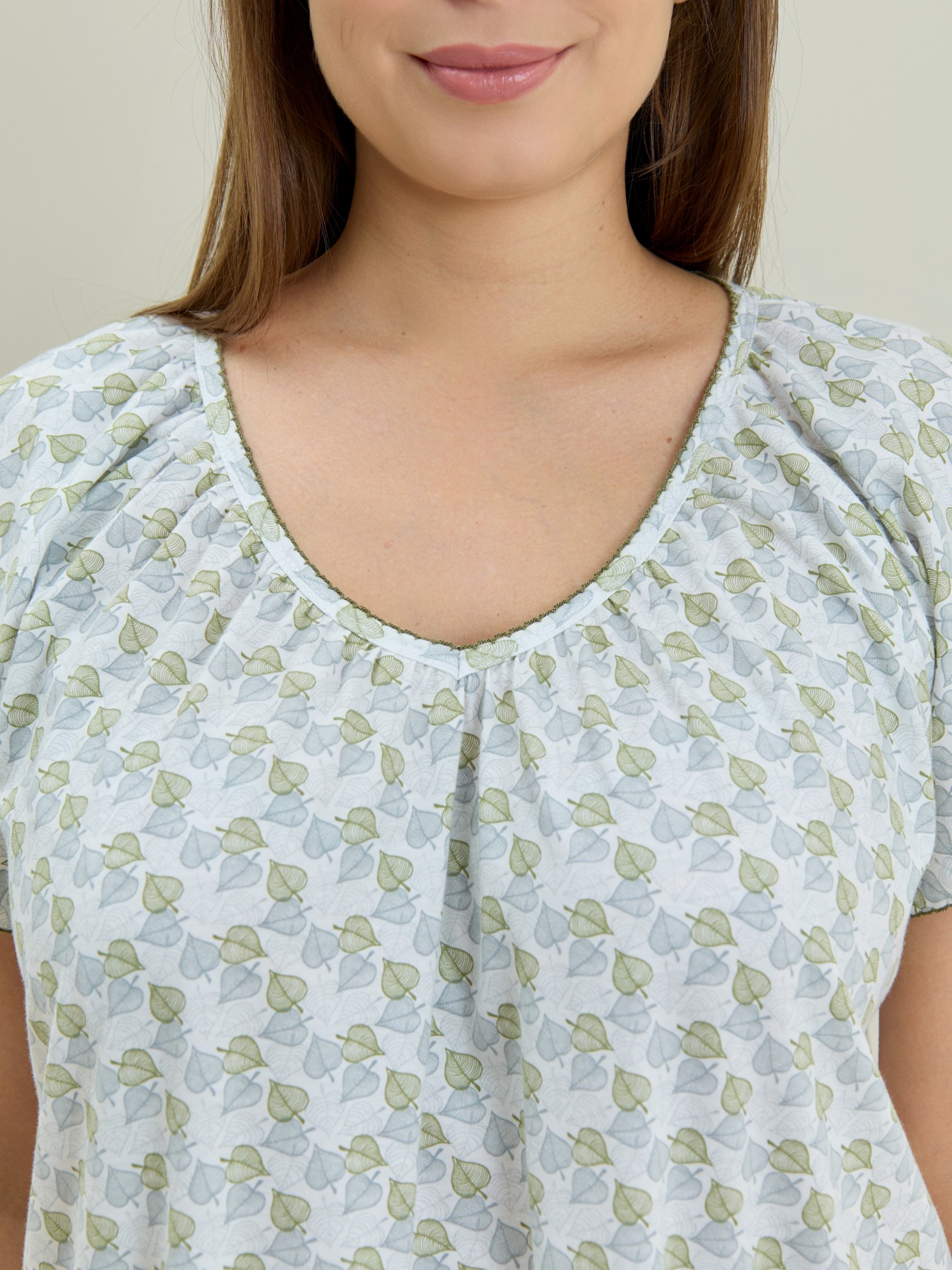Сорочка женская из трикотажного полотна «кулирка» с набивным рисунком свободного покроя, с короткими втачными рукавами покроя «реглан». Углубленная горловина V- образной формы, собрана по краю на сборку и окантована основным материалом. Низ изделия и нижние срезы рукавов обработаны узким обметочным швом нитками в тон изделия.