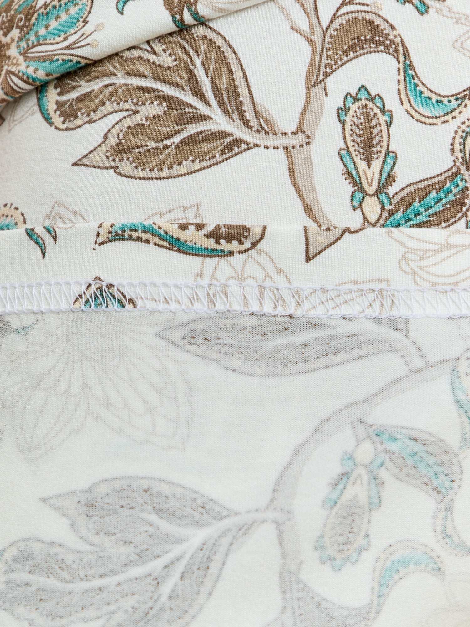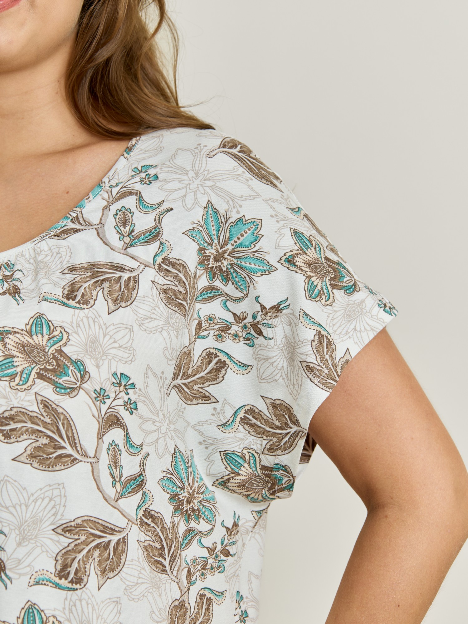 Сорочка женская из вискозного трикотажного плотна с набивным рисунком, свободного покроя, расширенная книзу, с короткими цельнокроеными рукавами и горловиной овальной формы, окантованными основным материалом. По центру горловины переда выполнена сборка.