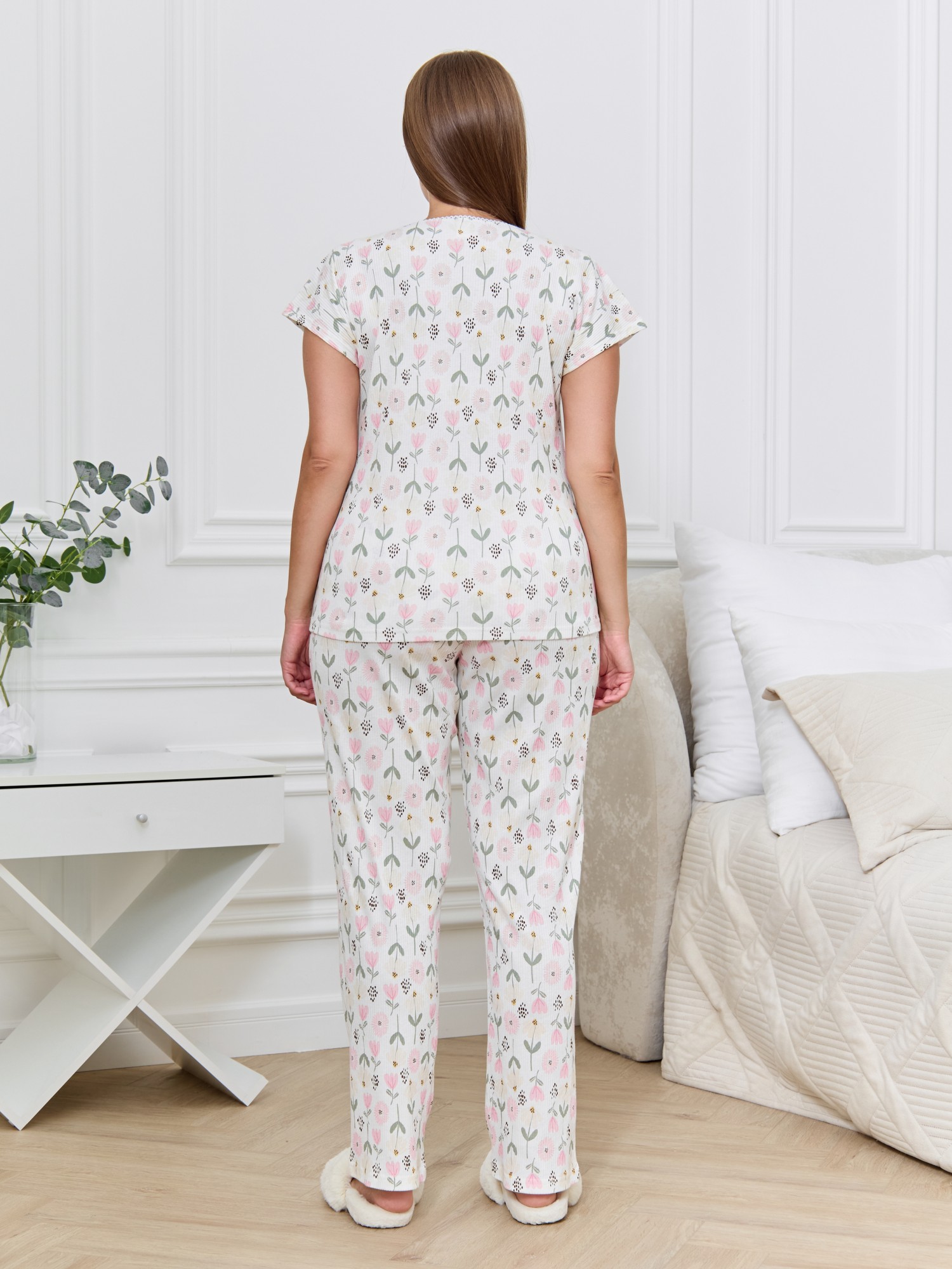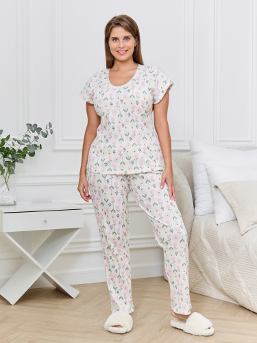 Пижама женская из трикотажного полотна «кашкорсе» с набивным рисунком, состоящая из футболки и брюк.Футболка - классического покроя с углубленной формой горловины, обработанной эластичной тесьмой с фасонным краем и цельнокроеными рукавами.Брюки – длинные, свободные, с эластичной тесьмой по талии.