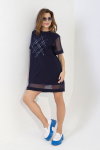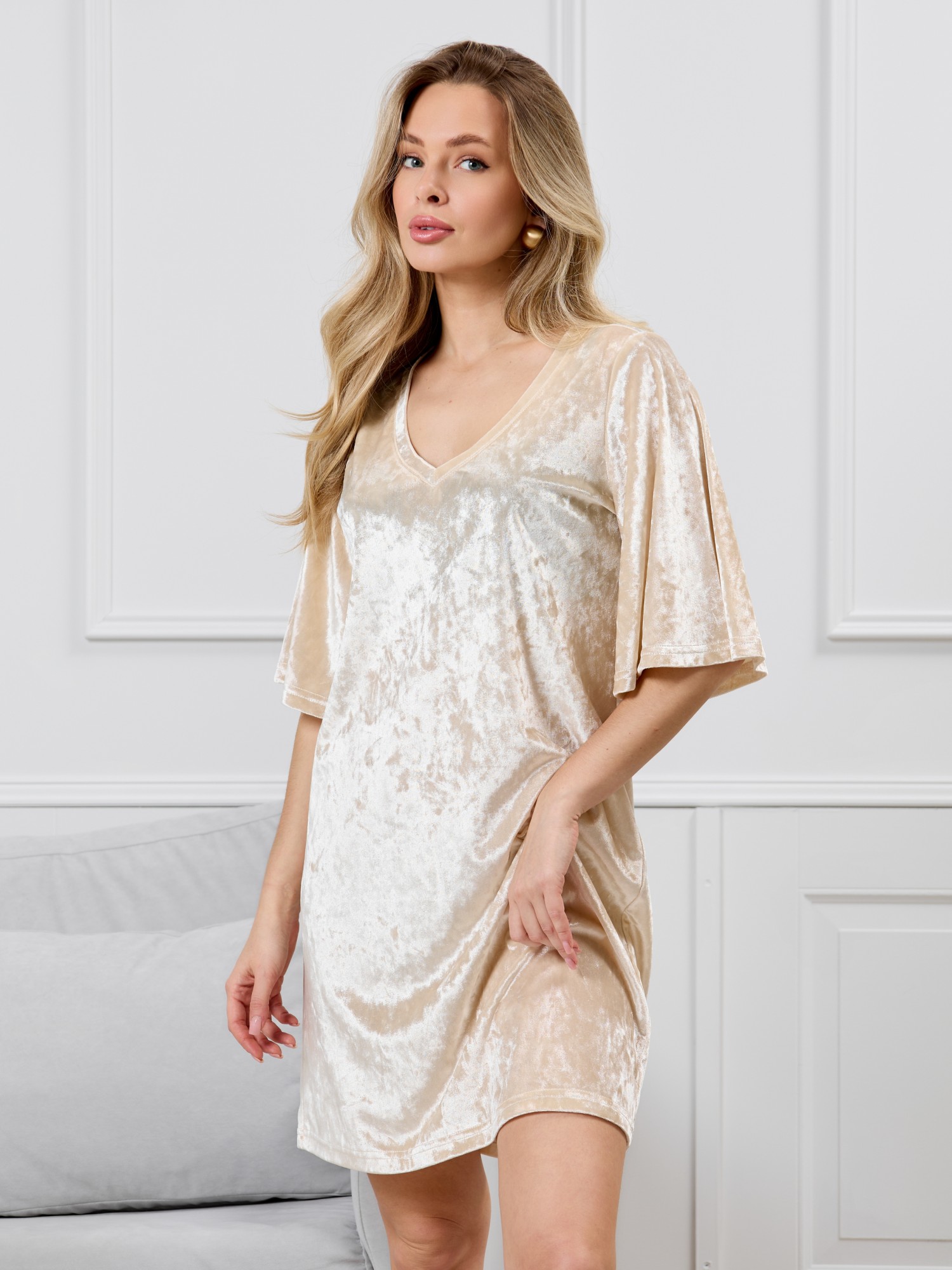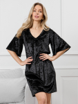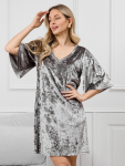 Туника молодежная из гладкокрашенного полотна «велюр стрейч» с мраморным эффектом, прямого силуэта слегка расширенная книзу, с горловиной V-образной формы, обработанной втачной планкой, с рукавами длиной до локтя, расширенные книзу в форме «конуса».
