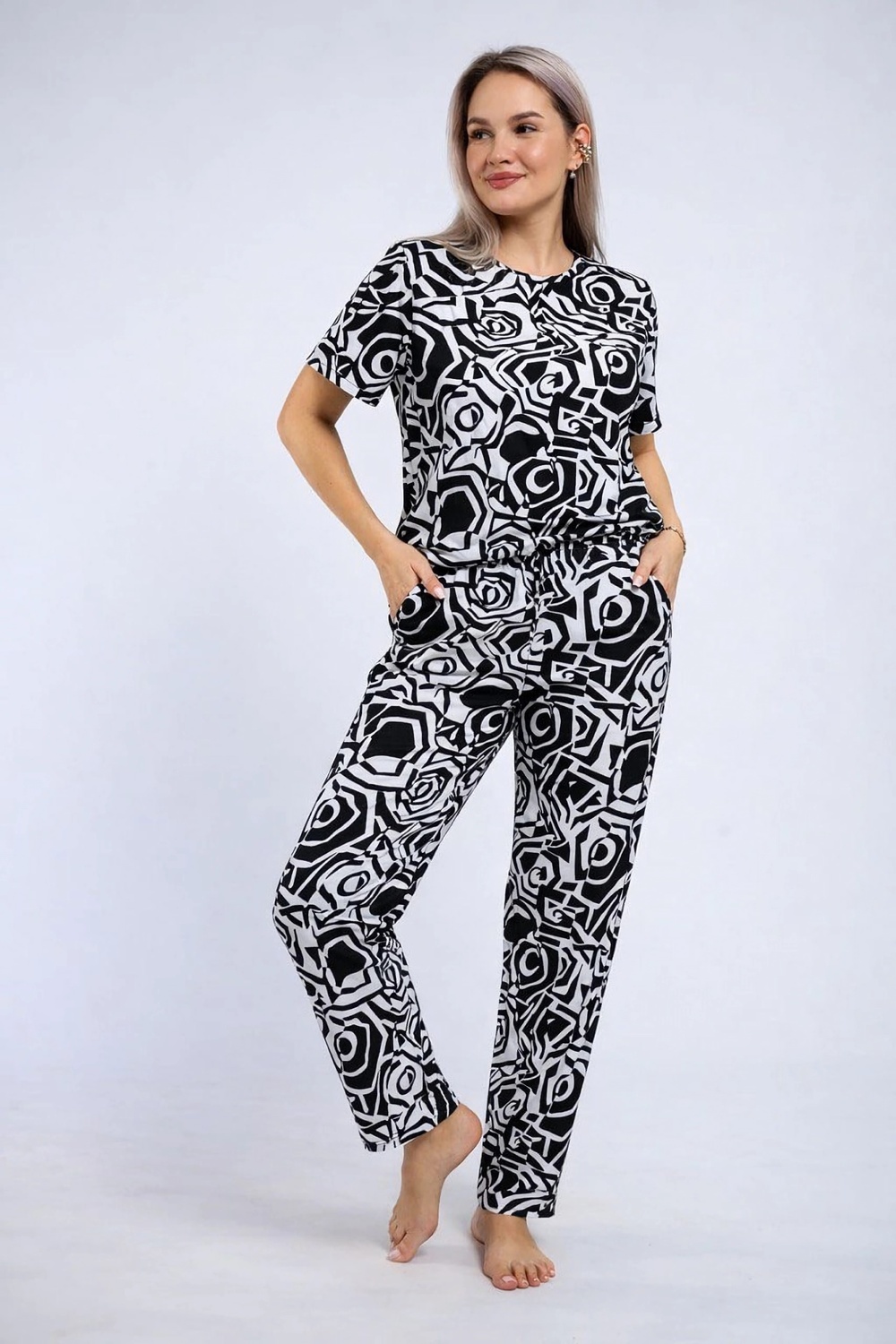 Предлагаются стильные и удобные пижамы из высококачественного материала натуральной кулирки 100% хлопка. Ткань отличается мягкостью, приятна к телу и обладает отличной воздухопроницаемостью, обеспечивая комфорт даже в теплую погоду. Благодаря натуральному составу материал абсолютно гипоаллергенен и безопасен для кожи любого типа. Изделия отличаются долговечностью и устойчивостью окраски, сохраняя свежий вид длительное время. Эти пижамы подарят идеальное сочетание стиля, удобства и здоровья, делая отдых приятным и расслабляющим. Цвет: абстрактные розы;черно-белые портреты; Материал: кулирка;кулирка; Состав: 100% хлопок.