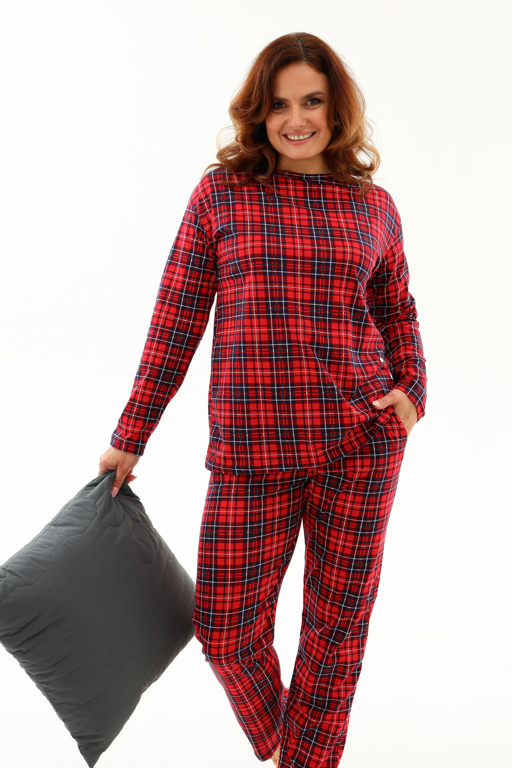 Уютный удобный костюм из натурального хлопка. Удлинённый лонгслив свободного кроя. Брюки с высокой посадкой свободного кроя с внутренними карманами. Пояс обработан на поясной машине, поэтому резинка не скручивается при эксплуатации. В измерении обхвата талии указан размер резинки, которая без проблем растягивается до стандартных значений фигуры. В этом костюме комфортно находиться в домашней обстановке. Носите с удовольствием ! Цвет: красная клетка;оливковый;зеленая клетка; Материал: кулирка;кулирка; Состав: Хлопок 100%..