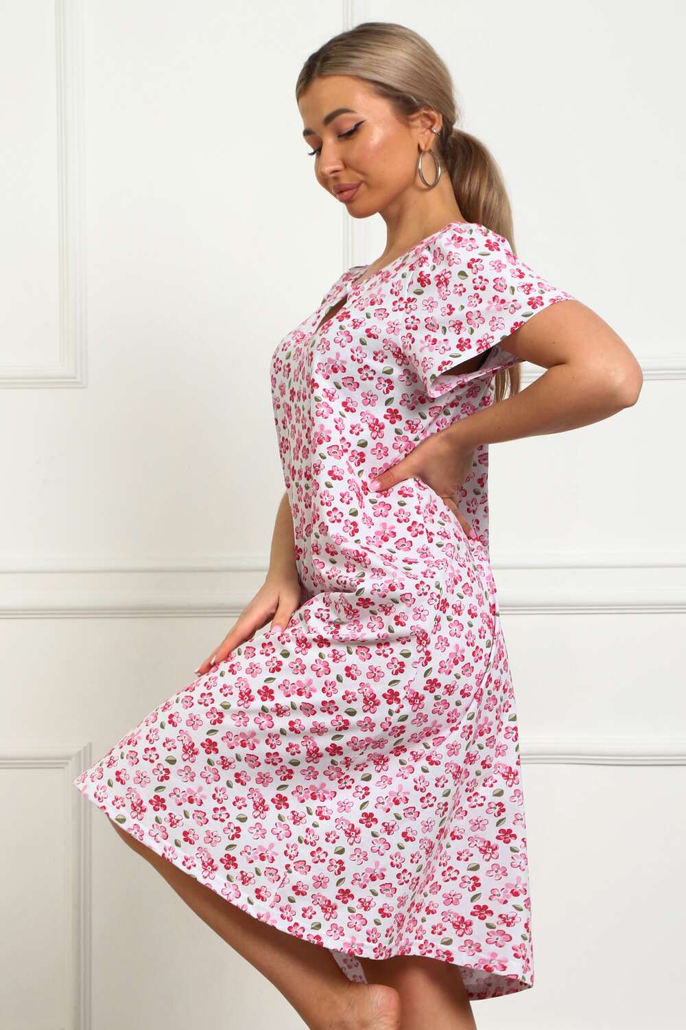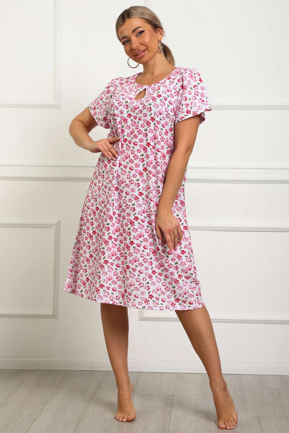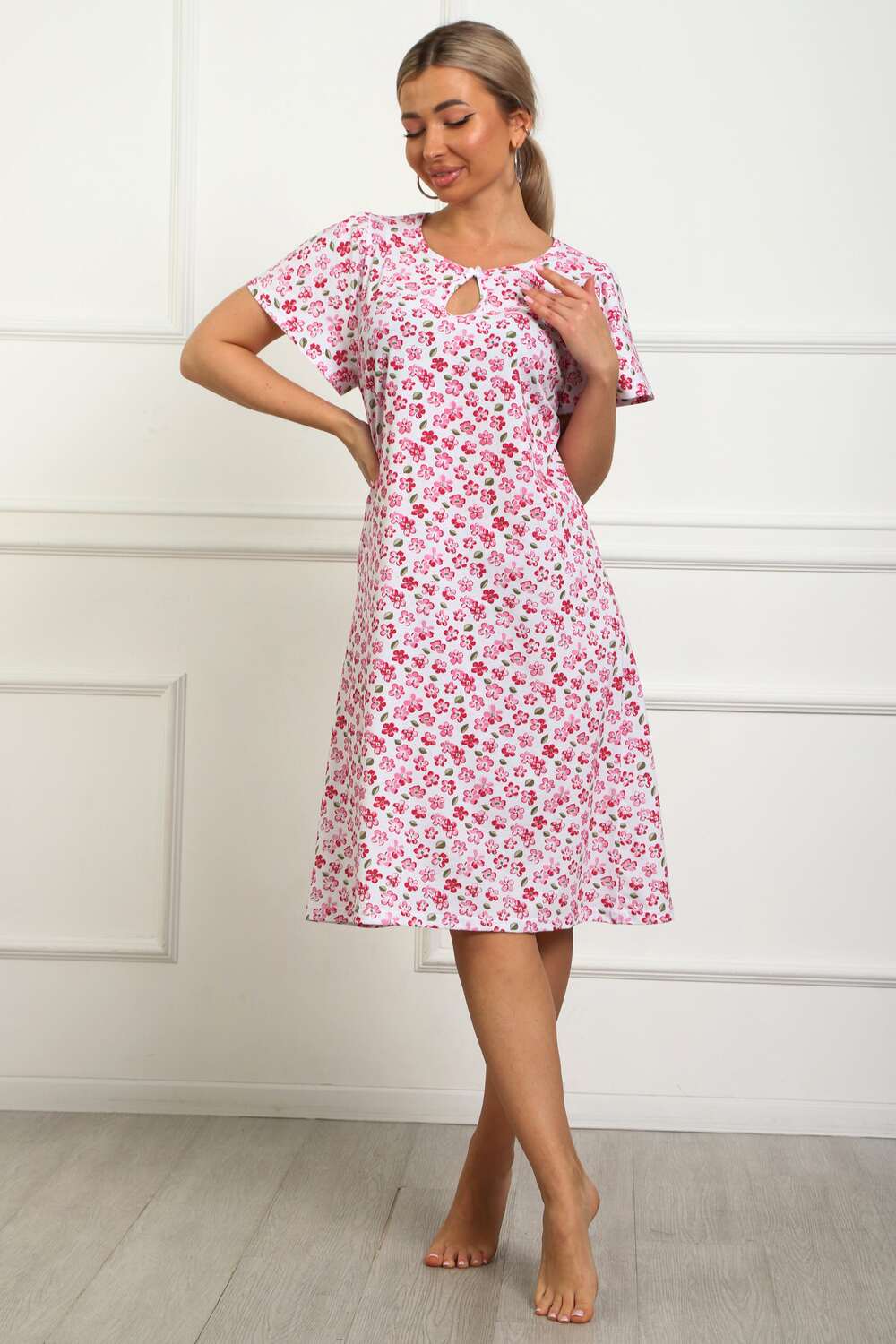 Сорочка женская из натурального набивного трикотажа, хлопок 100%. Силуэт свободный, расширенный к низу. Горловина круглой формы с капелькой по центру. Обработана окантовкой. Отделкой служит бантик. Рукав короткий, свободный. В верхней части оката выполнена небольшая сборка. Низ изделия прямой. Длина ниже колена. Цвет: белый + розовые цветы;белый + сиреневые цветы; Материал: кулирка; Состав: хлопок 100%.