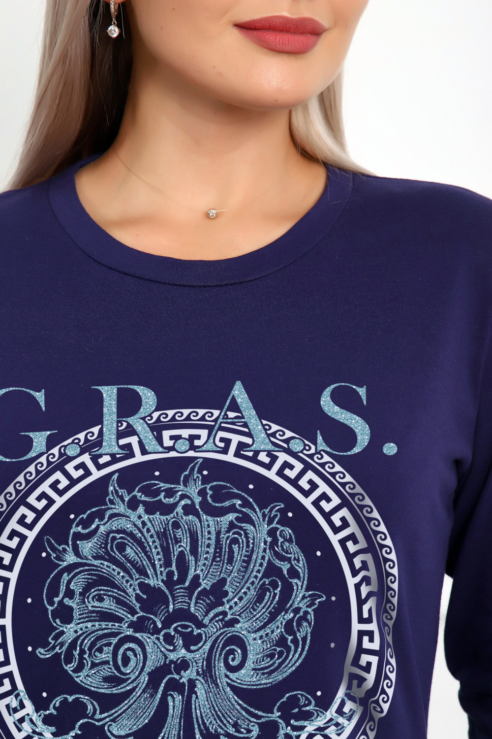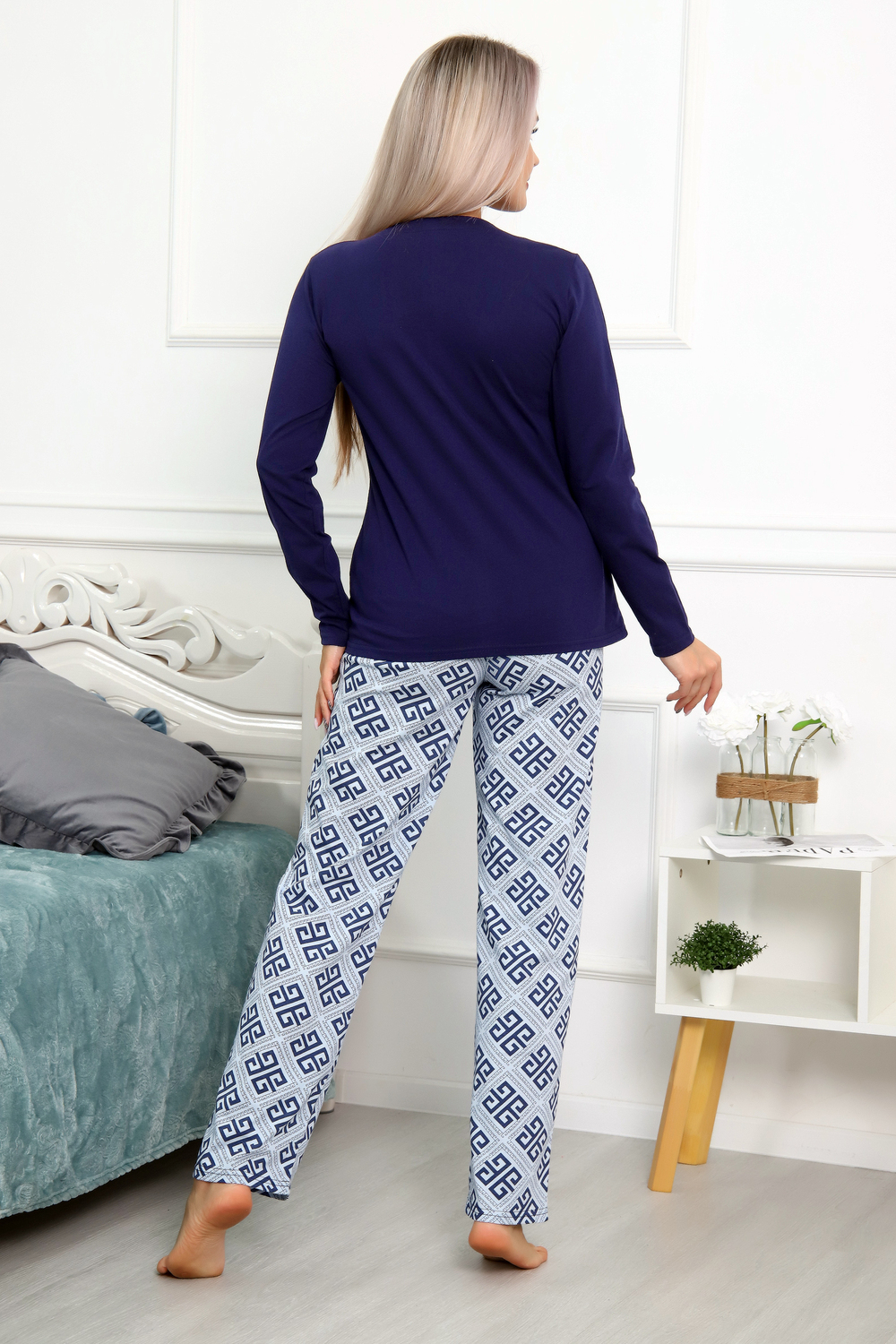 Пижама женская домашняя состоит из туники и брюк. Туника свободная, длиной до линии бедер, плечо спущенное, рукав втачной длинный. Горловина с обтачкой. На середине переда оригинальный принт. Брюки длинные, свободные без карманов. Пояс на резинке. Цвет: синий; Материал: кулирка;кулирка; Состав: 100% хлопок.