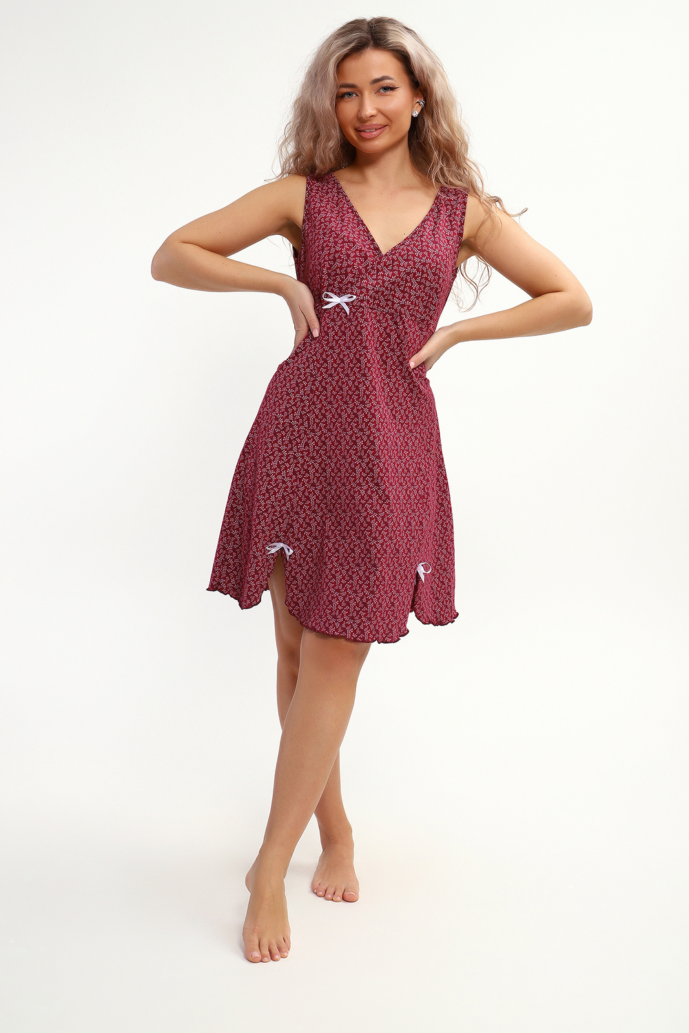 Сорочка с V образным вырезом. Полочка отрезная под грудью. Юбка с рельефами. Нашиты бантики. Подходит для беременных. Цвет: бордо; Материал: кулирка;кулирка; Состав: хлопок 100%.
