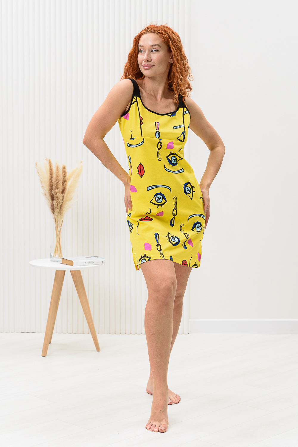 Сорочка на широких бретелях, полуприлегающего силуэта, длиной выше колена, с обработанными разрезами с нижней части боковых швов. Полочка с кокеткой. Проймы, бретели и горловина полочки обработаны бейкой из отделочного полотна. Цвет: белый;желтый; Материал: кулирка;кулирка; Состав: 100% х/б.