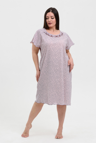 Сорочка женская из натурального набивного трикотажа, хлопок 100%. Силуэт свободный, расширенный к низу. Горловина круглой формы с капелькой по центру. Обработана окантовкой. Отделкой служит бантик. Рукав короткий, свободный. В верхней части оката выполнена небольшая сборка. Низ изделия прямой. Длина ниже колена.