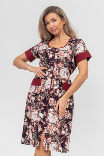 Халат женский оригинальной летней расцветки, на молнии, с боковыми карманами, с коротким рукавом, изготовлен из трикотажного полотна кулирка выполнен из 60% хлопка, 40% полиэстера. Выполнен из кулирки. Общая длина приблизительно до коленей, очень приятный к телу.