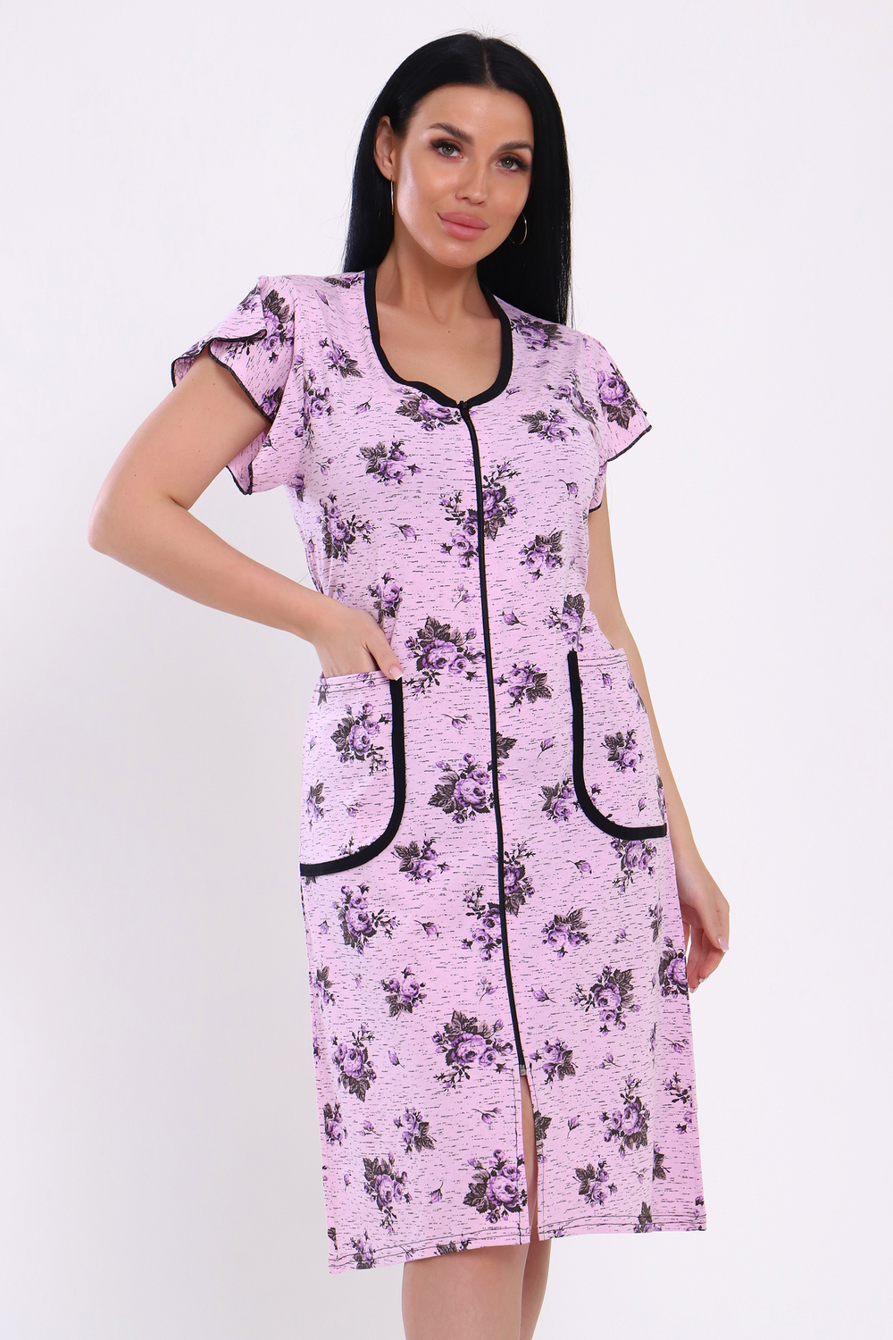 Оригинальный женский халат с красивым принтом на ткани. Рукав короткий, с накладными карманами, круглой воротник. Застежка-молния, длина ниже колена, очень приятный к телу.
