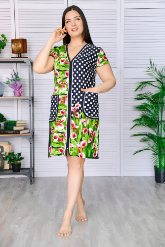 Платье-халат женский из набивного кулирного полотна, прямой силуэт, рукав короткий, в боковых швах внутренние карманы, застежка на петли-пуговицы, низ изделия обработан на плоскошовной машине. Благодаря натуральному составу вам будет комфортно и уютно. Халат выполнен по эксклюзивному лекалу. Это модель прекрасно подходит для дома, дачи, отдыха. Оригинальный принт выглядит модно и современно.