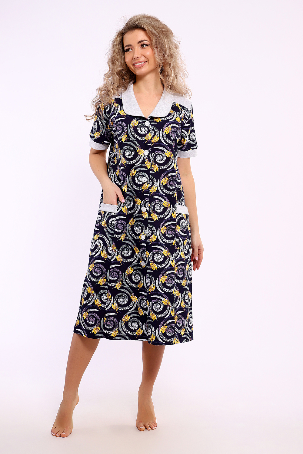 Халат домашний на пуговках, удлиненный, воротник из отделочной ткани. По полочке - рельефные швы, они обеспечивают удобство посадки. Имеются боковые карманы.