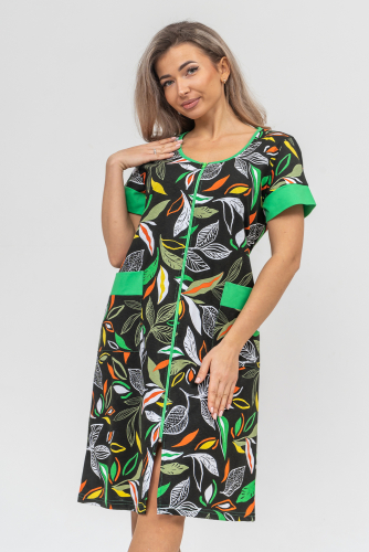 Халат женский домашний, средней длины на молнии, с комфортной посадкой по фигуре. Украшением изделия служит комбинирование тканей: полоска и однотонная ткань. С одной стороны полочки - отрезная кокетка с накладным карманом вверху и внизу. Ткань изделия - кулирная гладь 100% хлопок.