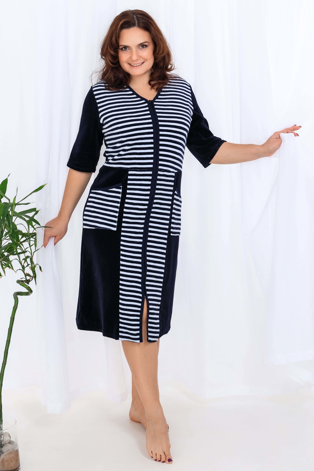 Халат женский из велюра, на молнии. Полочка отрезная по линии талии, в боковых швах два полупояса, рукав короткий. Размерный ряд имеет большие размеры. Ткань велюр - 80% хлопок, 20% полиэстер