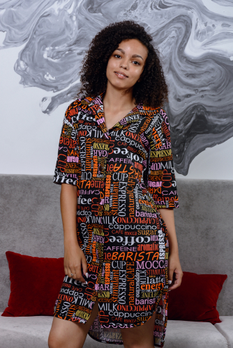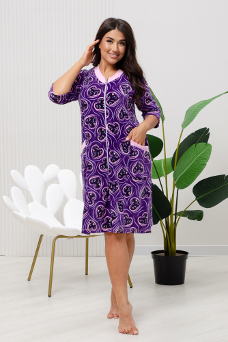 Халат женский прямого силуэта. Рукав цельнокроенный корокий. На полочке два накладных кармана. В боковых швах разрезы. Край борта, низ рукава, верх кармана обработаны широкой окантовкой. По низу халата купон розы, так же этот принт возможен на рукаве. На модели 52 размер