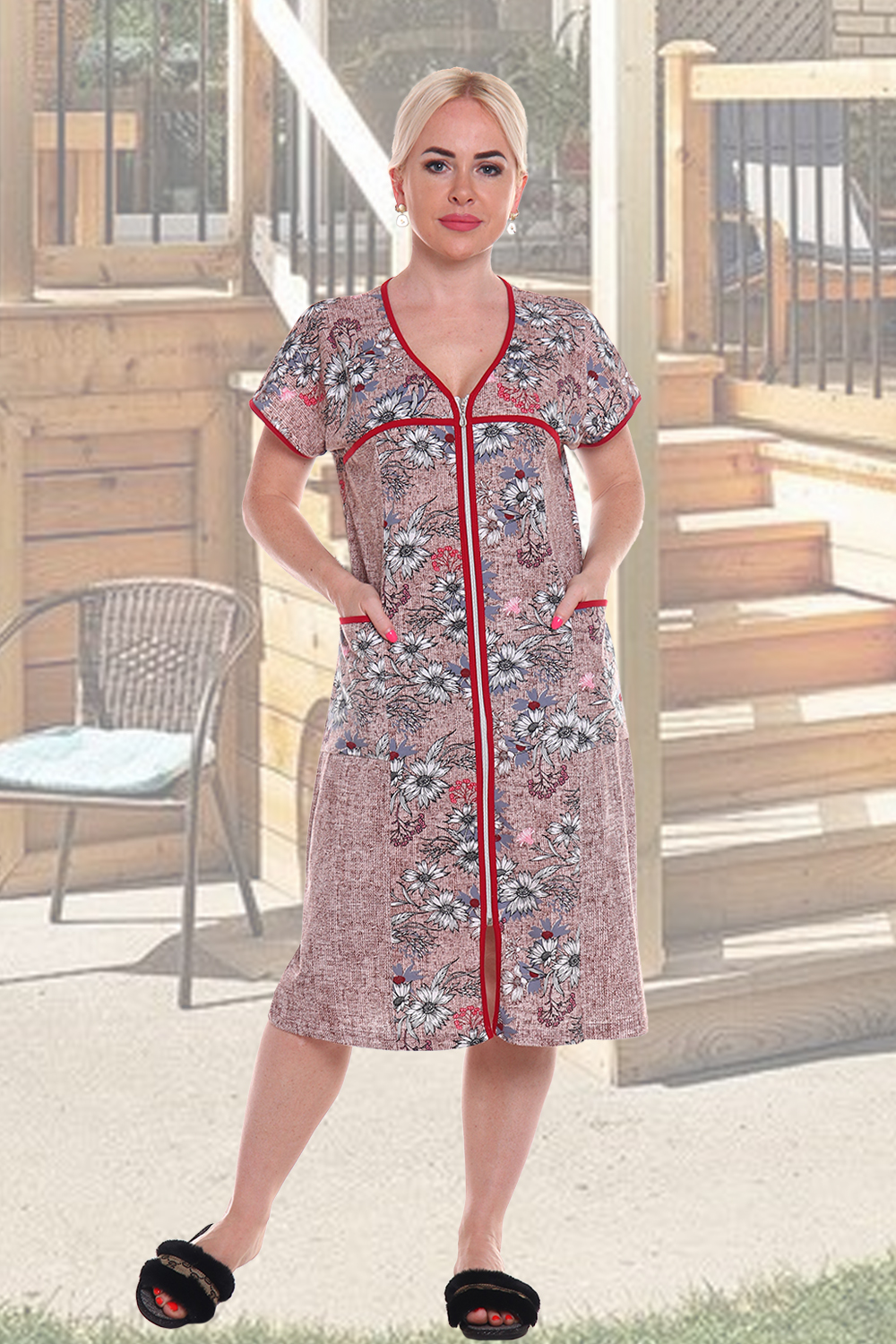 Комбинированый халат полуприлегающего силуэта с двумя накладными карманами в рельефных швах