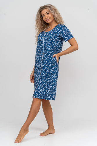 Этот халат выполнен в классическом стиле с принтом, состоящим из множества бабочек. Основной фон халата сочетает в себе светлые оттенки с мелким горошком, создавая нежный и романтичный образ. Халат имеет короткие рукава и длину до колена, что делает его удобным для повседневного использования. Центральная застежка-молния проходит по всей длине, позволяя легко надевать и снимать халат. Дизайн включает вставки с различными узорами, создавая контраст и визуальный интерес. Карманы на передней части халата добавляют практичности, а легкий пояс на спине подчеркивает талию.