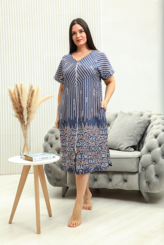 Халат с застежкой на молнию, полуприлегающего силуэта, длиной ниже колена, с V-образной горловиной. Рукав спущенный, короткий, с манжетом. В верхней части полочки расположены кокетки. Спинка с кокеткой. С разрезами в нижней части боковых швов. Горловина обработана бейкой из основного полотна.