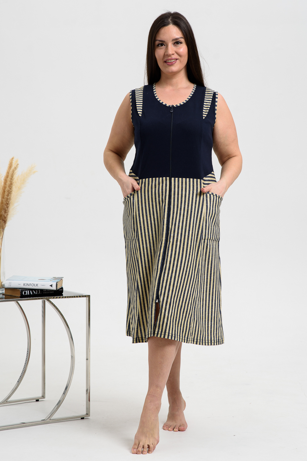 Халат на молнии, полуприталенного силуэта, без рукава, с округлой горловиной, длиной ниже колена, с боковыми карманами. Полочка и спинка с вертикальными рельефами. Верхняя часть халата выполнена из отделочного полотна. Горловина, проймы и карманы обработаны бейкой из основного полотна.