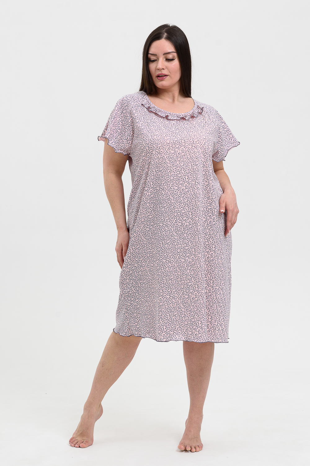 Сорочка женская больших размеров с симпатичной рюшей по горловине. Очень свободный и удобный крой. Рукав-реглан, не стесняет движения рук. Обработка рукава и низа изделия в виде лёгкой волны придаёт лёгкость и воздушность.