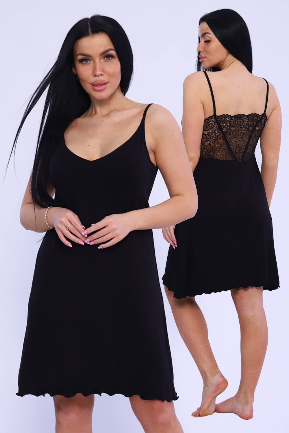 Сорочка женская на узких бретелях с широким стрейч-кружевом на спинке. Модель приталенного силуэта, на груди фигурный V-образный вырез, удобный двойной лиф. Сорочка-миди женственная, стильная, из приятной к телу вискозы. Ткань отличается мягкостью и легкостью, а благодаря наличию в составе лайкры обладает способностью растягиваться и возвращаться к первоначальному размеру. Длина изделия в таблице измерений указана от наивысшей точки плеча.
