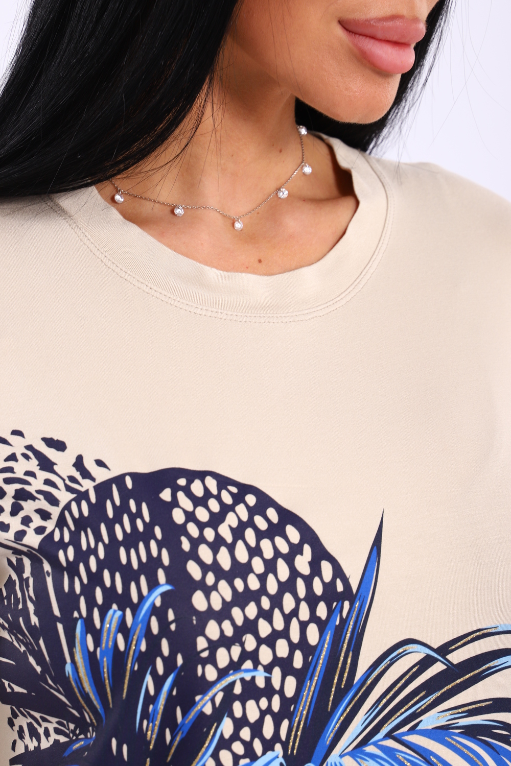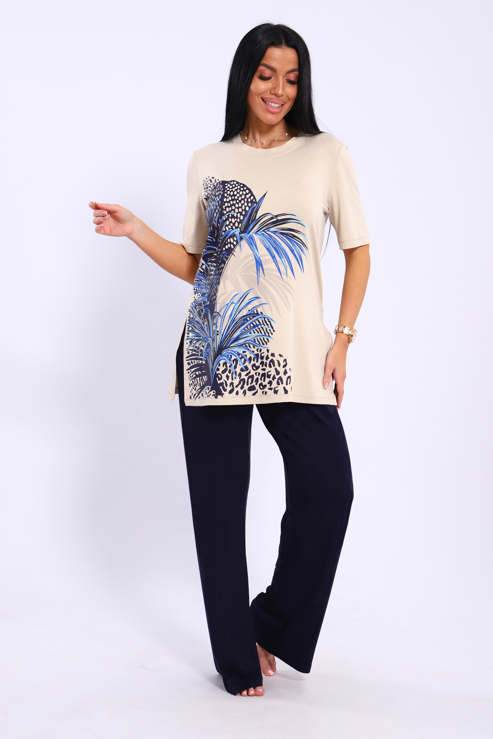 Трикотажный костюм с брюками и удлиненной футболкой с разрезами по бокам, выполнен из премиальной вискозы с добавлением эластана, имеющий размерный ряд с 46-го по 56-й размеры Цвет: бежевый+синий; Материал: вискоза;вискоза; Состав: 95% вискоза 5% эластан.