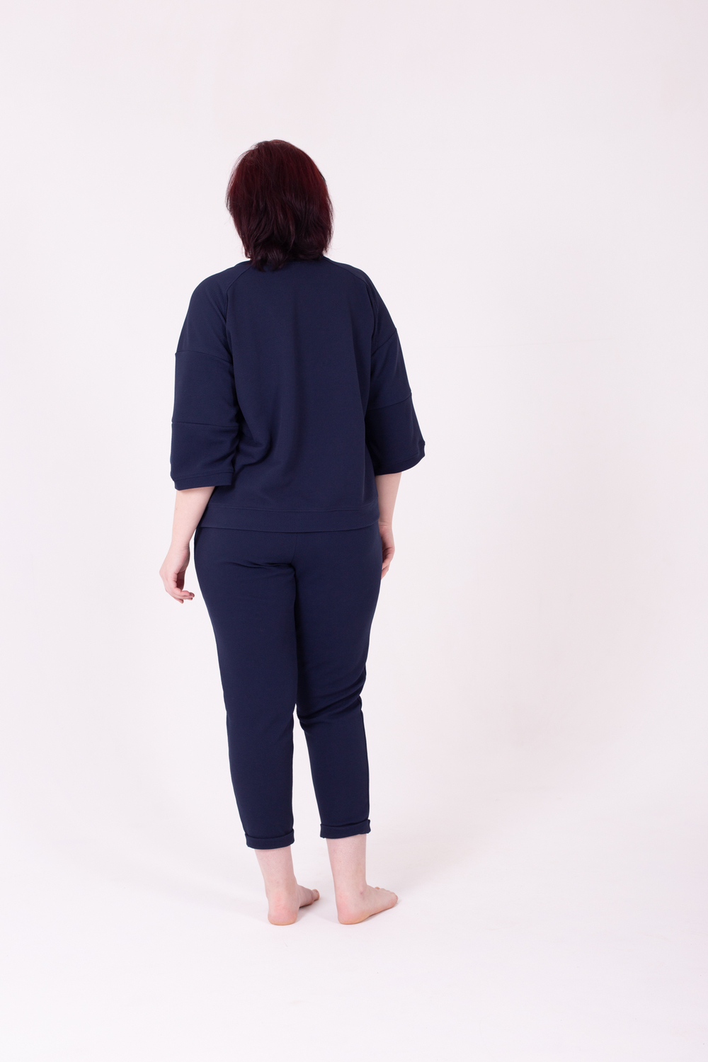 Костюм женский с брюками на резинке и свободной кофтой с рукавами 3/4. Модель выполнена из качественного футера 2-х нитки. Цвет: черный;синий; Материал: футер 2-х нитка;футер 2-х нитка; Состав: Хлопок 75%, полиэстер 20%, лайкра 5%.