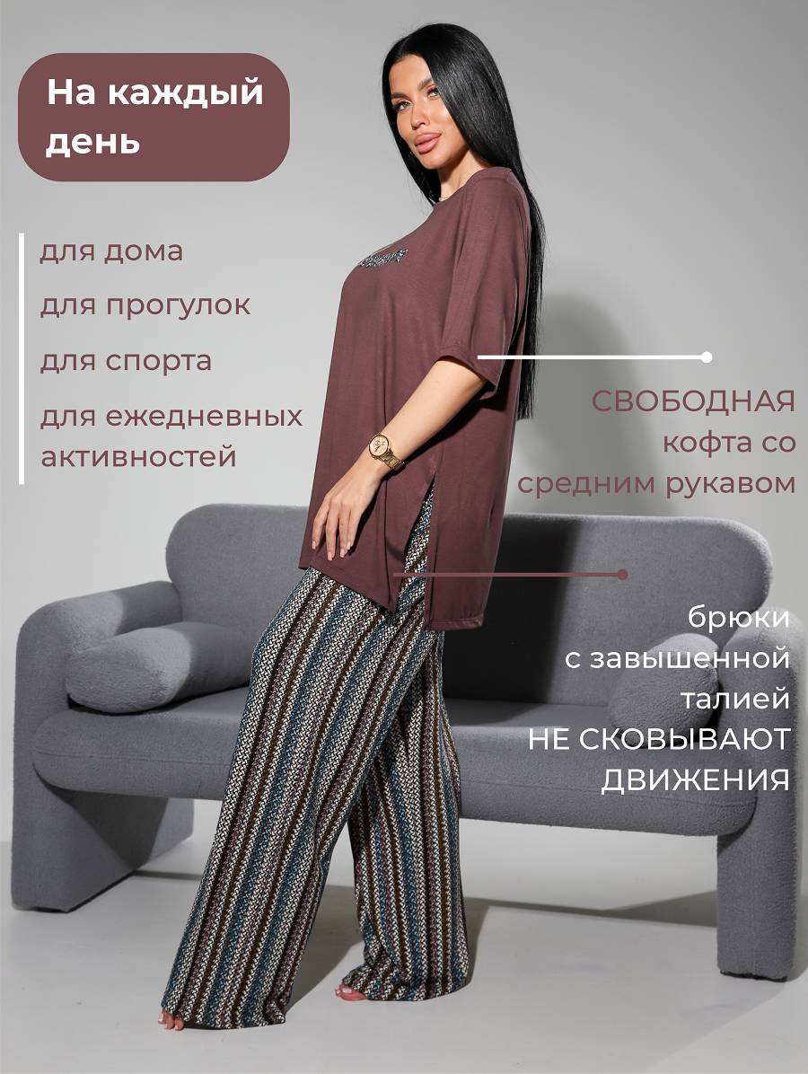 Подарите себе истинное наслаждение комфортом и элегантностью с женским домашним костюмом от бренда NINEL. Этот комплект, состоящий из свободной футболки и удобных брюк, создан для того, чтобы вы чувствовали себя расслабленно и уверенно в любой домашней обстановке. Цвет: сливовый; Материал: вискоза;вискоза; Состав: 95% вискоза, 5% эластан.