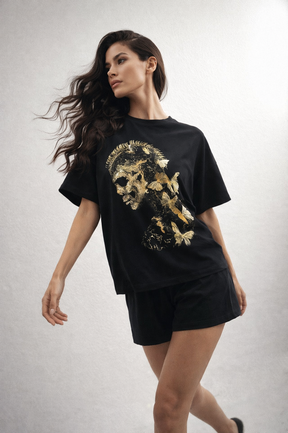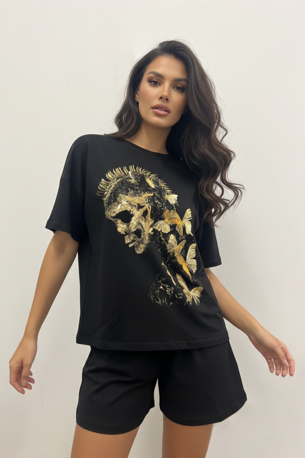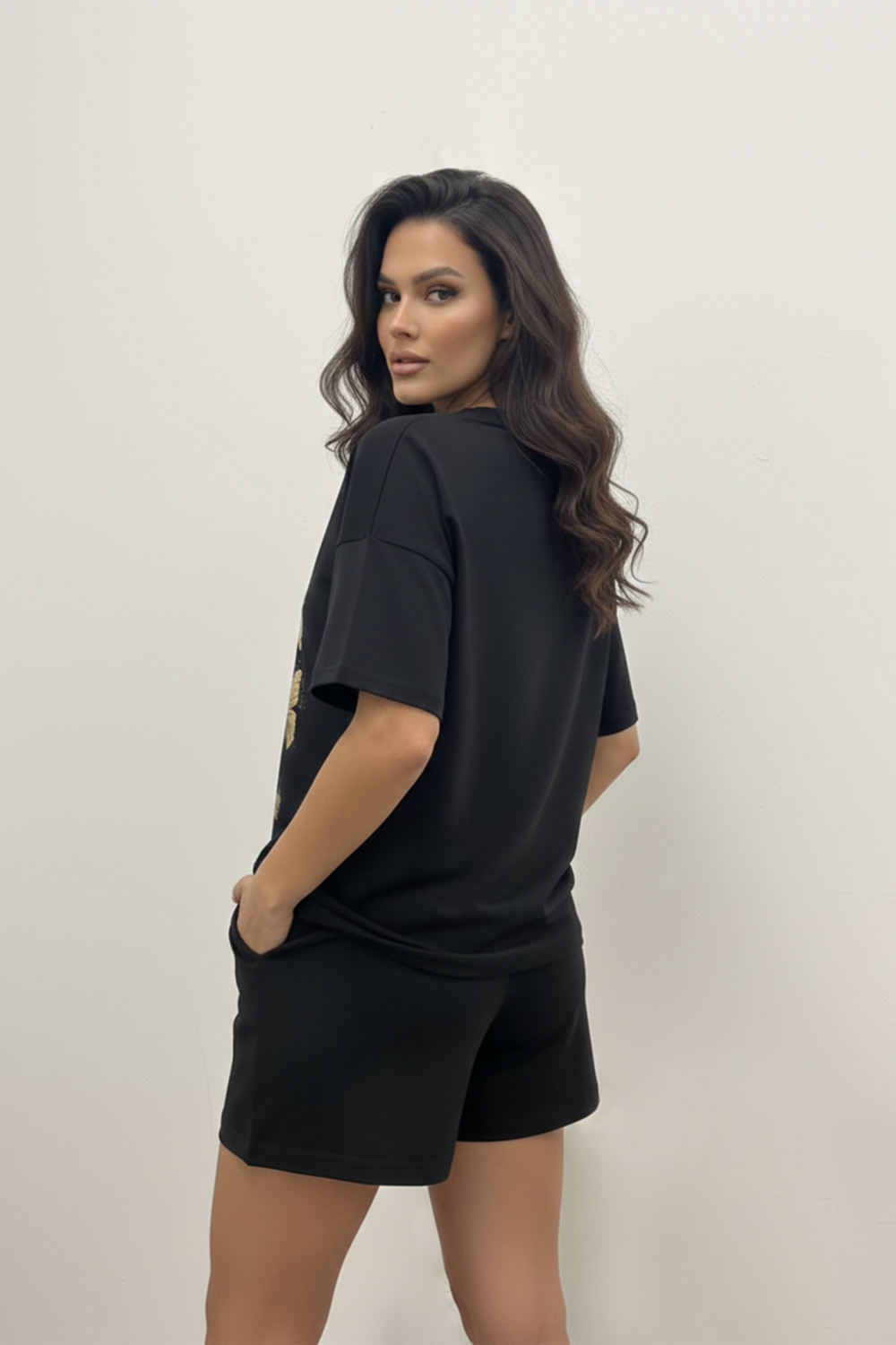 Удобный женский трикотажный костюм с шортами и футболкой свободного кроя отлично подойдет для прогулок, для активного отдыха, походов за покупками, да и просто для дома. Эта модель произведена из качественного хлопка. на футболку нанесен оригинальный принт. Цвет: черный; Материал: кулирка с лайкрой;кулирка с лайкрой; Состав: 92% хлопок, 8% лайкра.