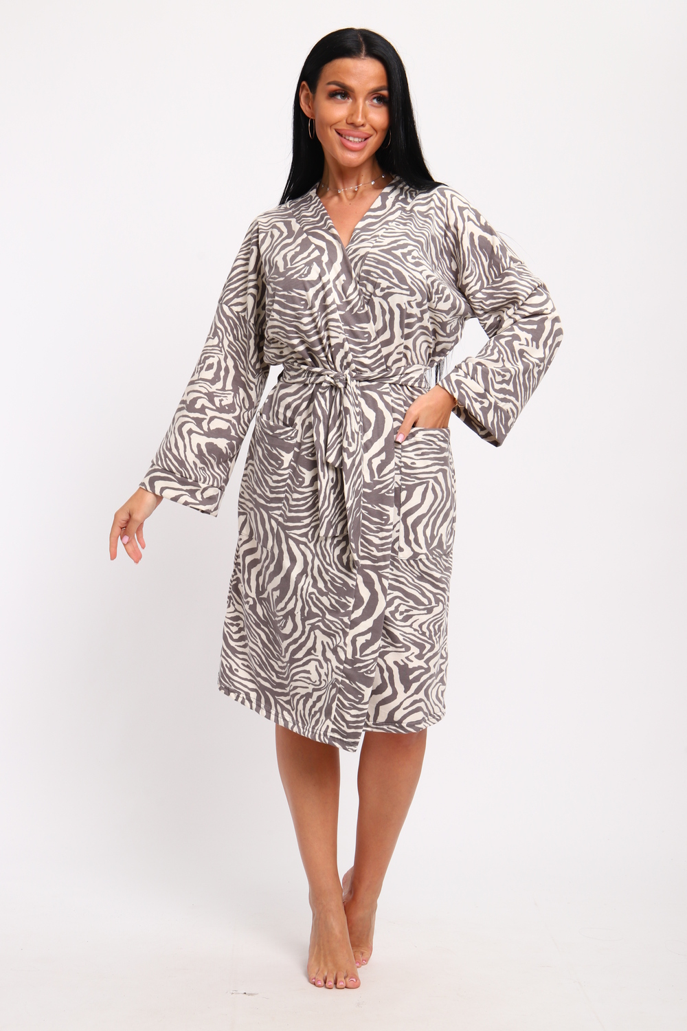 Халат женский запашной свободного кроя, с карманами и поясом. Длинный рукав на спущенном плече.