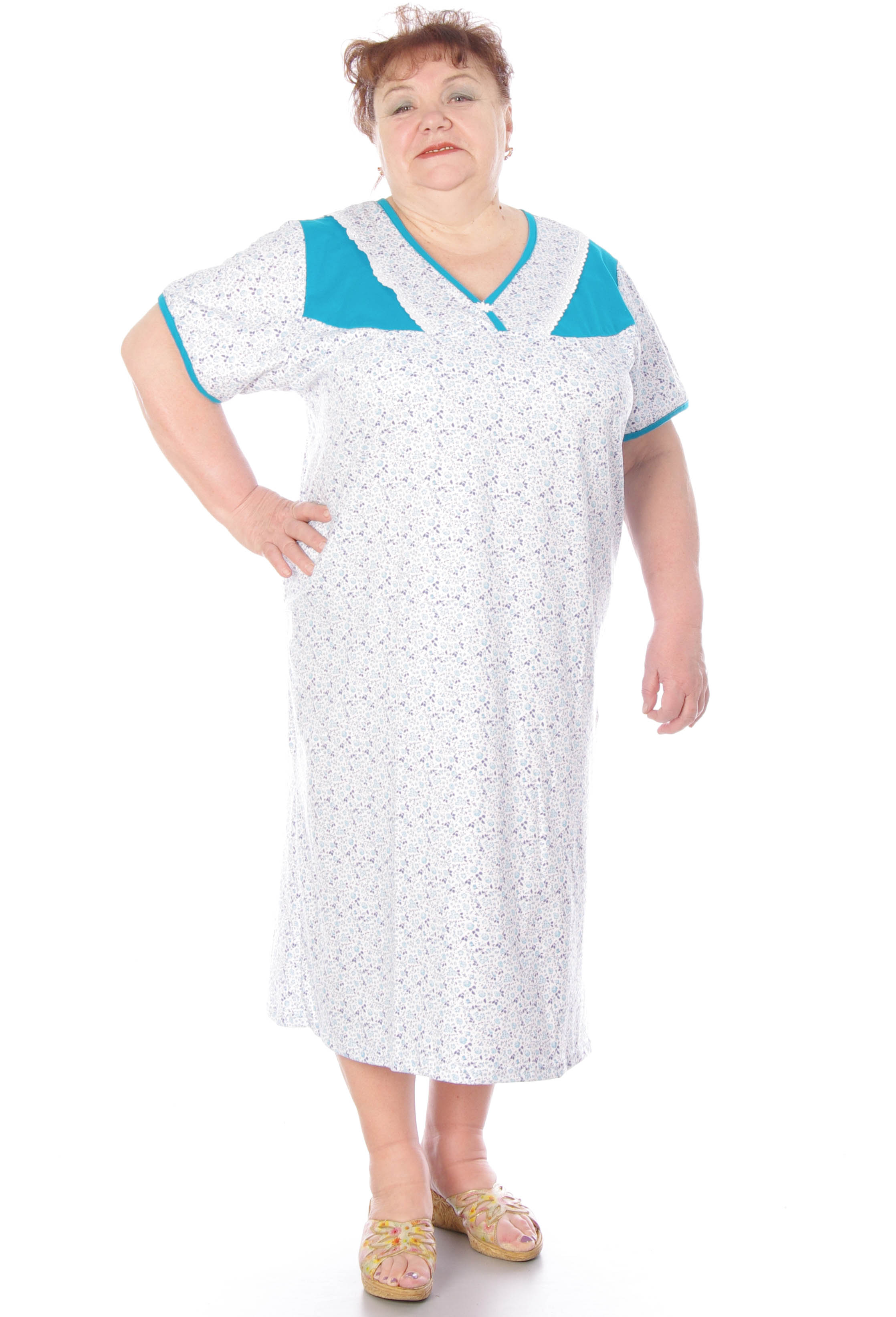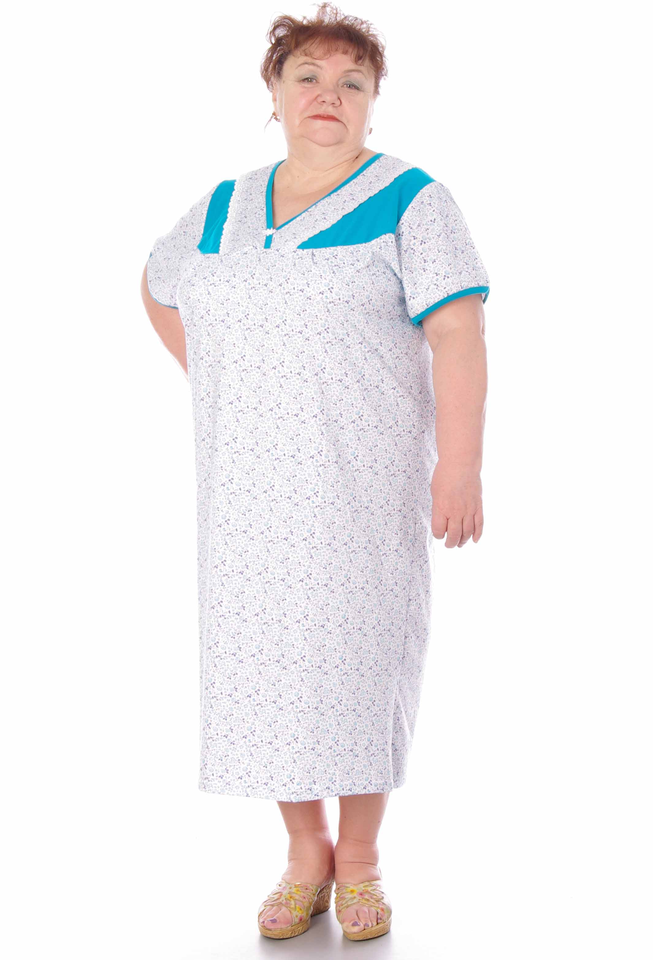 Ночная сорочка с отрезной кокеткой из мягкой кулирки. Модель прямого фасона, комфортной и удобной длинны, для женщин больших размеров.