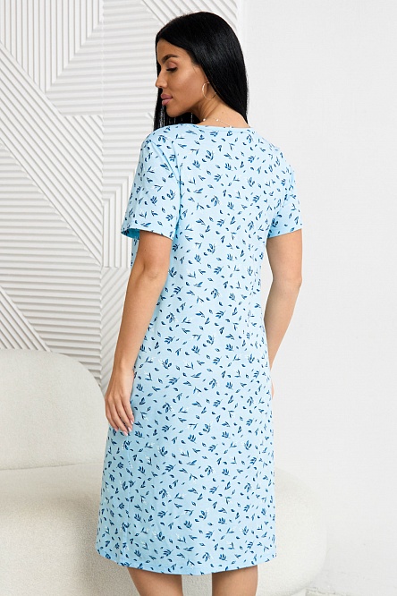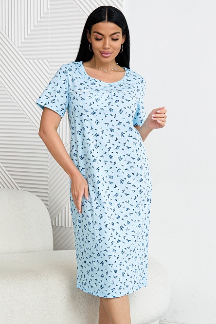 Ночная сорочка из трикотажного хлопкового полотна, голубого оттенка с изысканными цветочными мотивами.