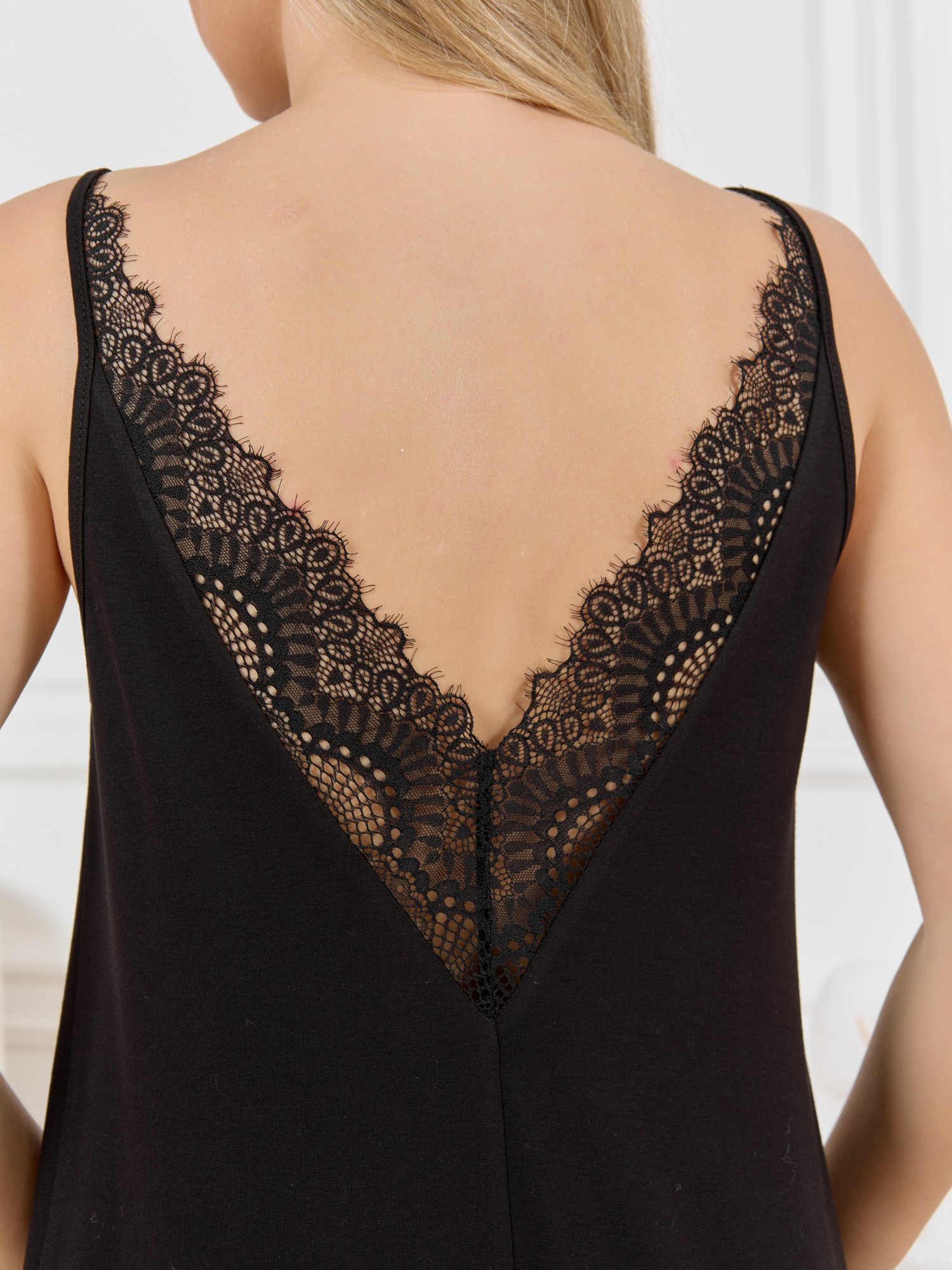 Сорочка молодежная из гладкокрашеного трикотажного вискозного полотна на узких бретелях, полуприталенного силуэта, слегка расширенная книзу. V-образная горловина полочки и спинки отделана кружевными вставками треугольной формы. Проймы окантованы основным материалом.