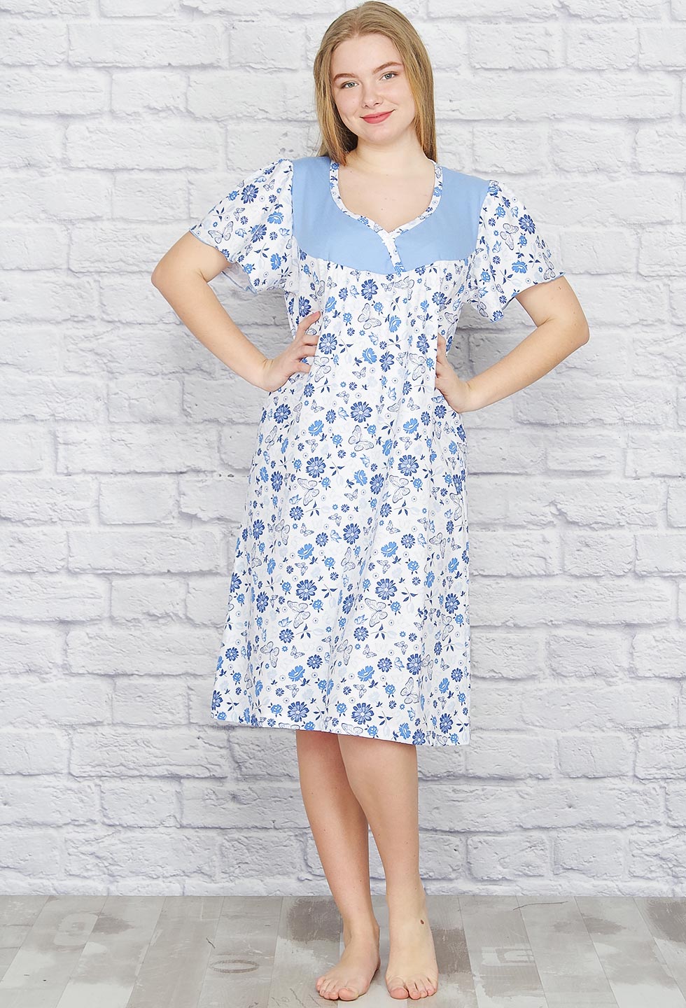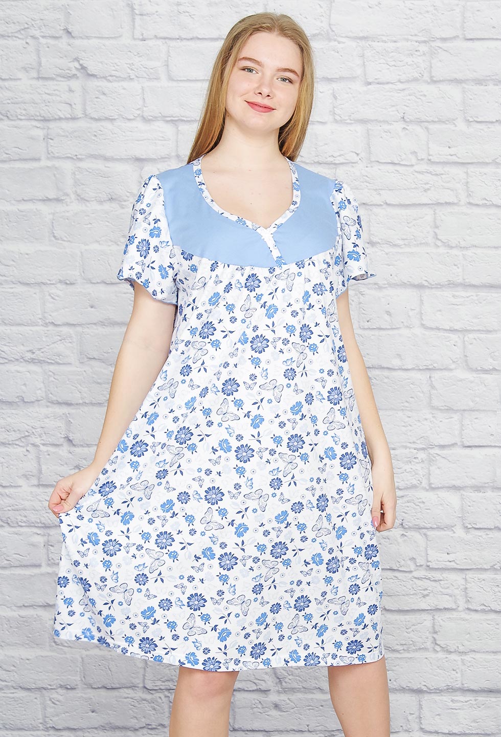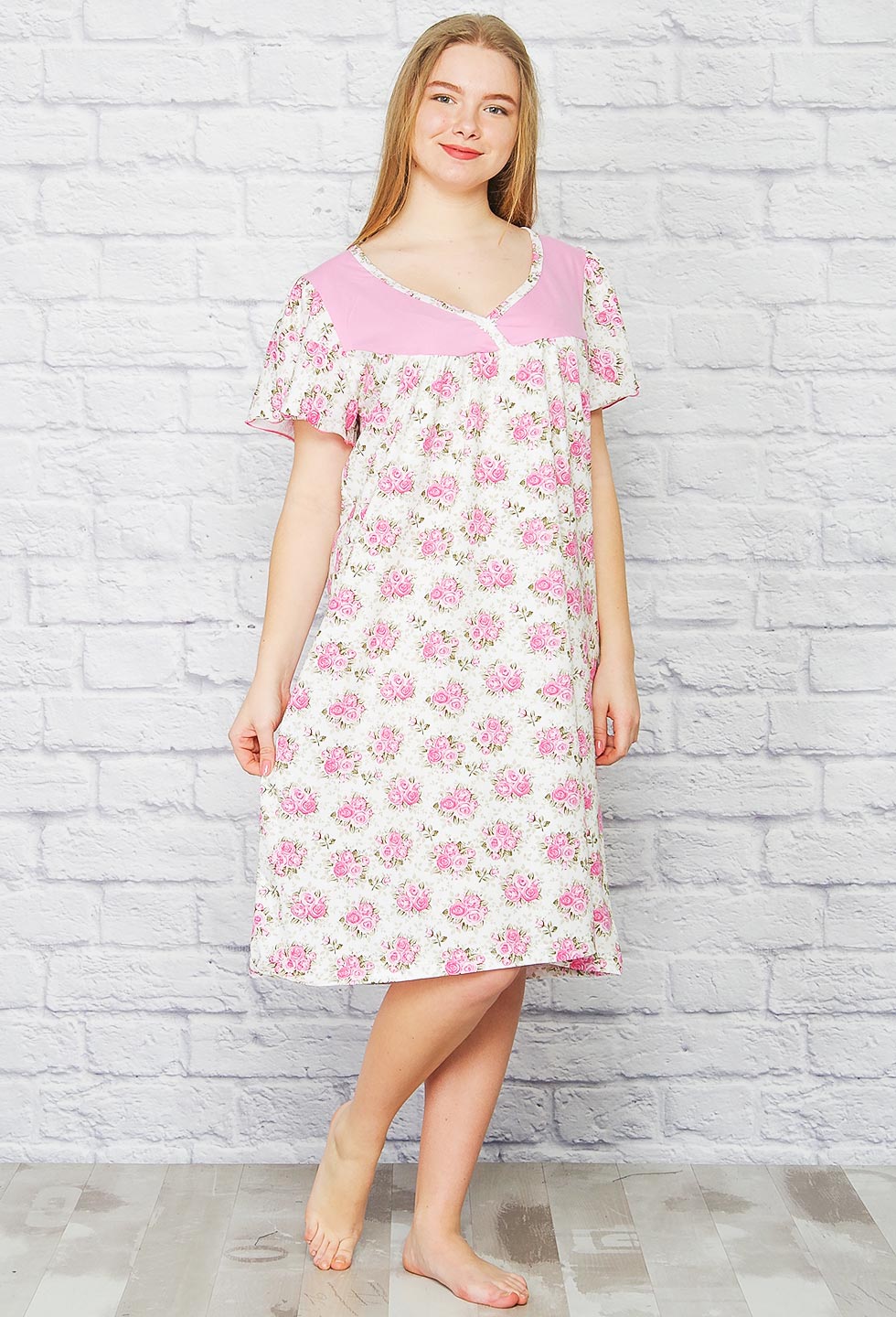 Ночная хлопковая сорочка с отрезной кокеткой, короткий рукав, комфортная длина.