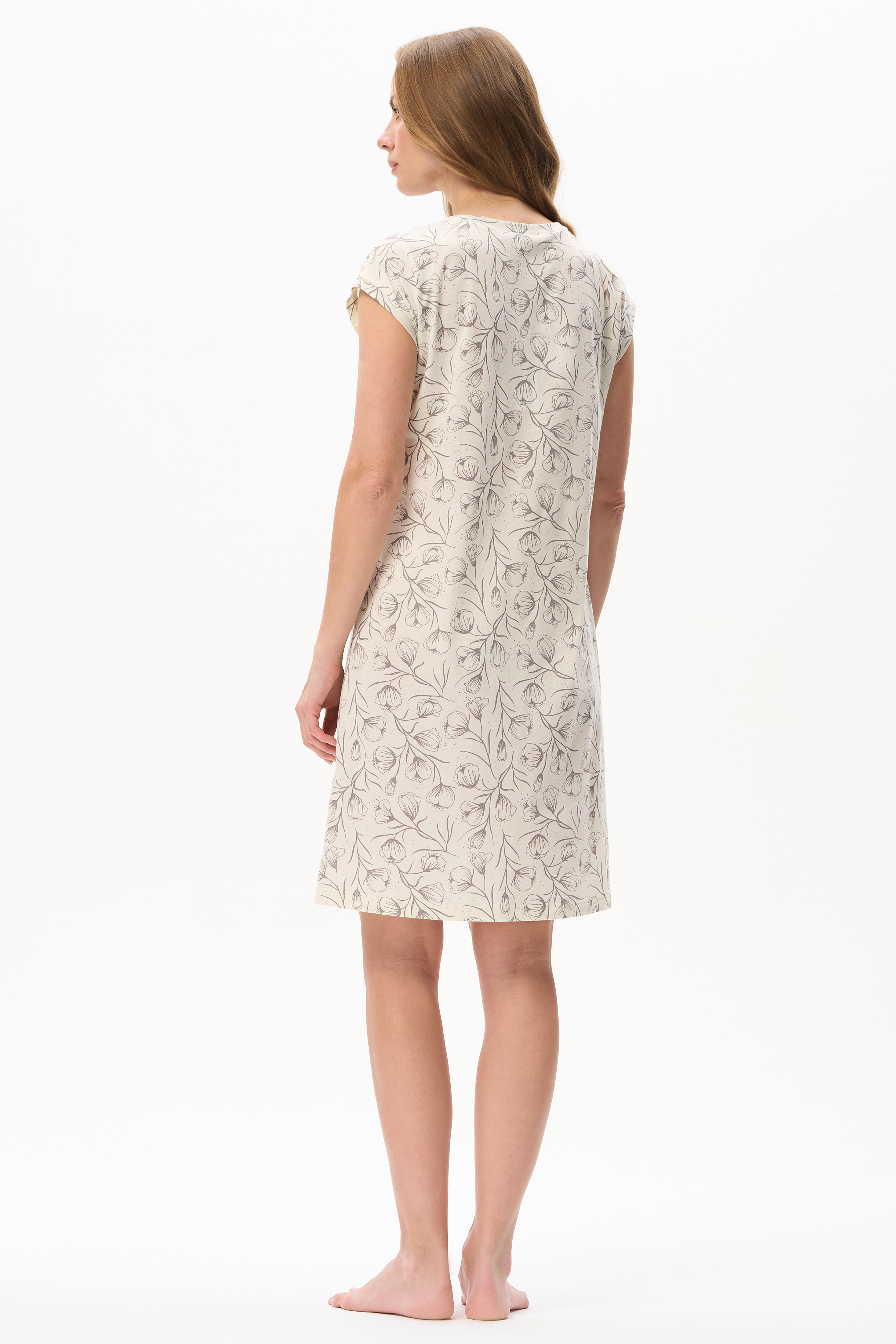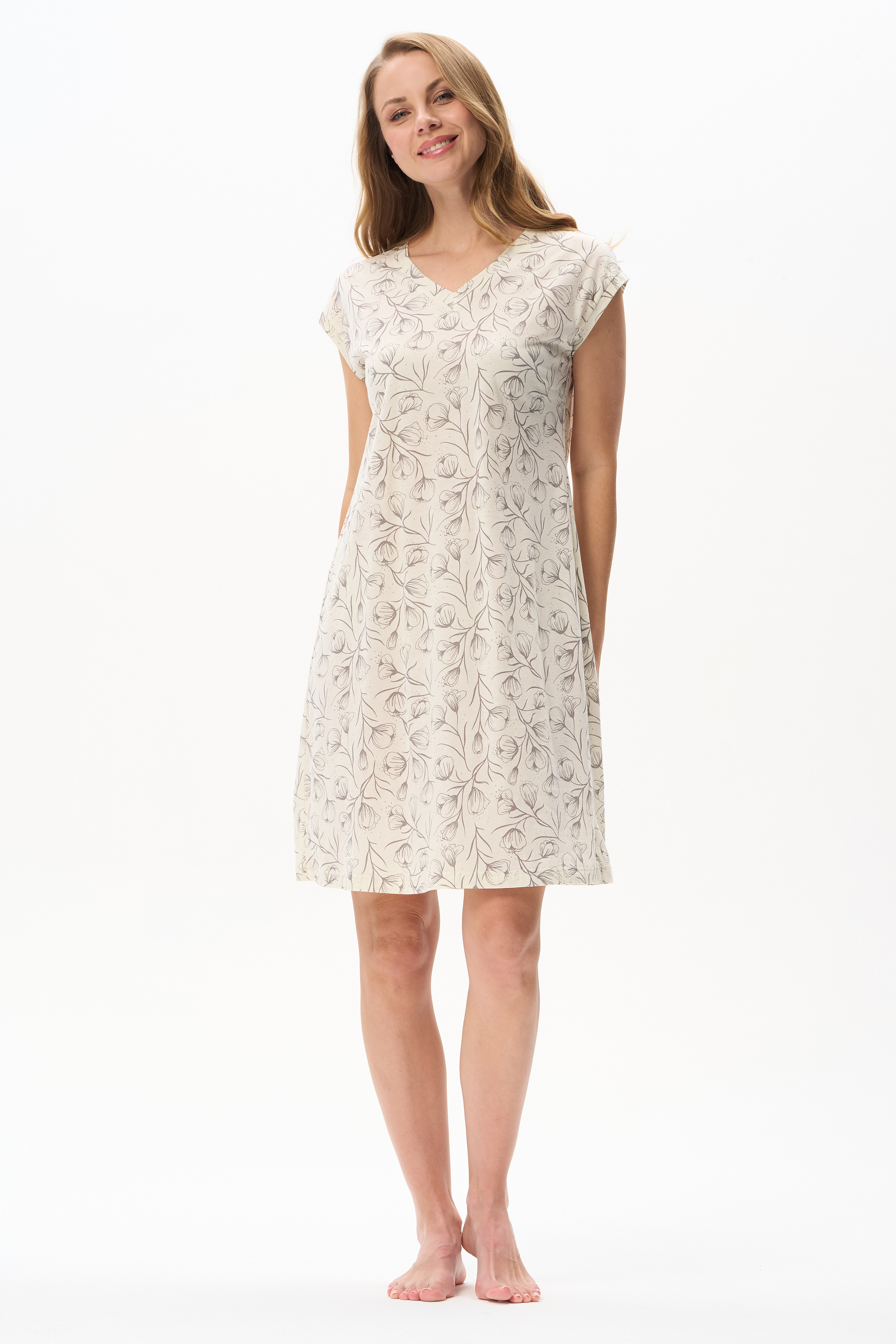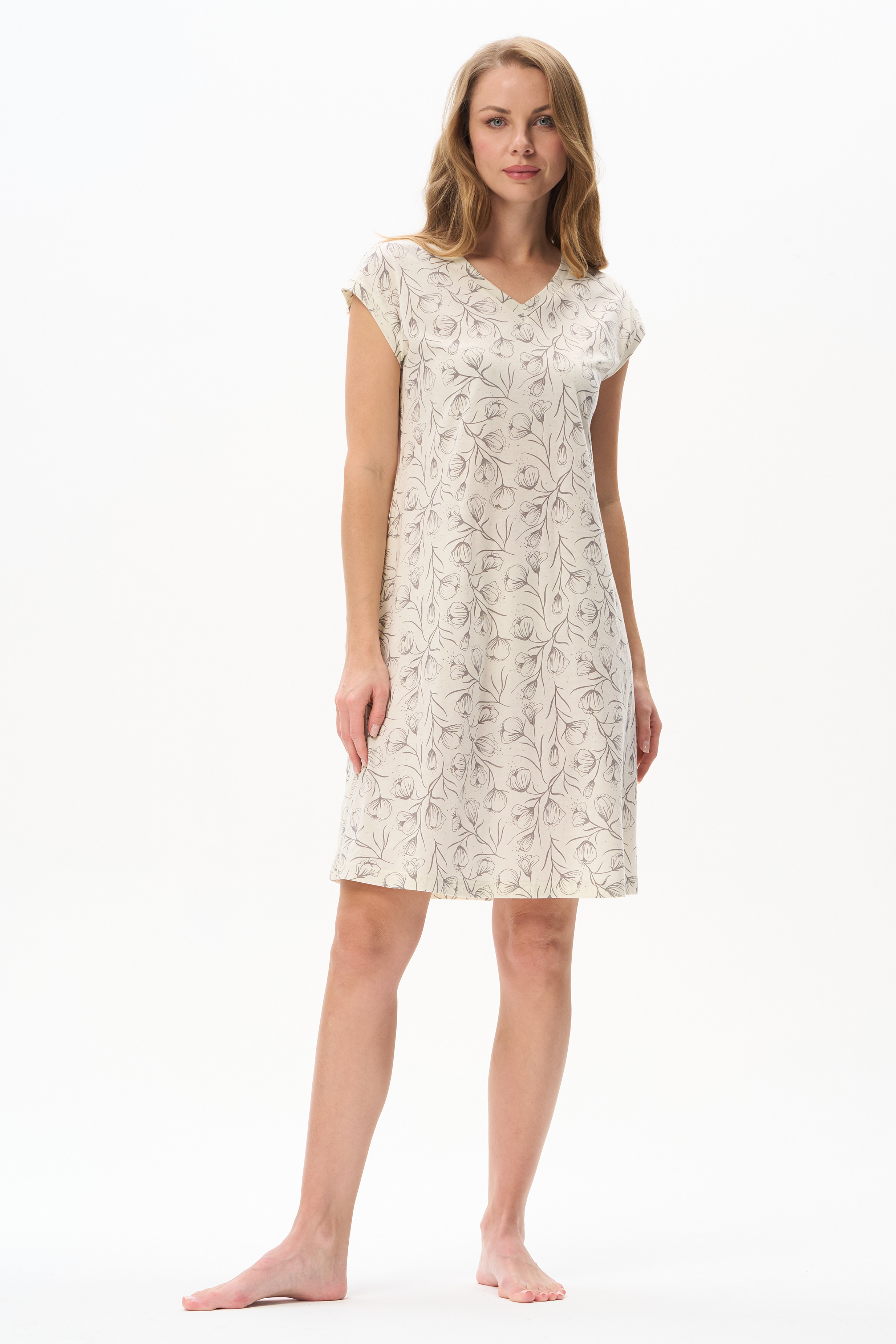 Сорочка из кулирки качества пенье 110 гр. Дизайнерский рисунок в стиле LORY - Контурная цветочная графика Распускающиеся бутоны в Сливочном оттенке на фоне Перламутровое облако. Модель А-образного силуэта, красивый V-образный вырез горловины обработан планкой. Цельнокроеные короткие рукава с притачными манжетами, длина выше колена. Модель для комфортного сна, позволяет коже дышать и очень приятая к телу. Рост модели на фото 175 см.