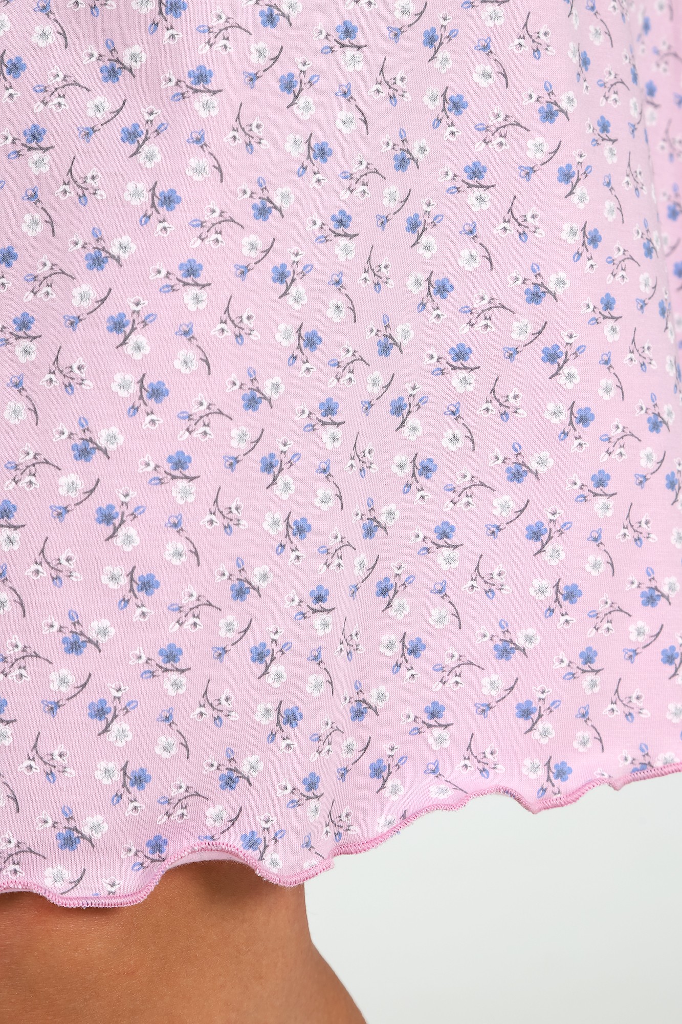 Сорочка женская из трикотажного полотна «кулирка» с набивным рисунком, расширенная книзу, без рукавов, с расширенной, углубленной горловиной овальной формы и притачной кокеткой по переду. Срезы пройм и горловины, а также шов притачивания кокетки, обработаны фасонной эластичной тесьмой с кружевным краем. Низ изделия обработан узкой обметочной строчкой.