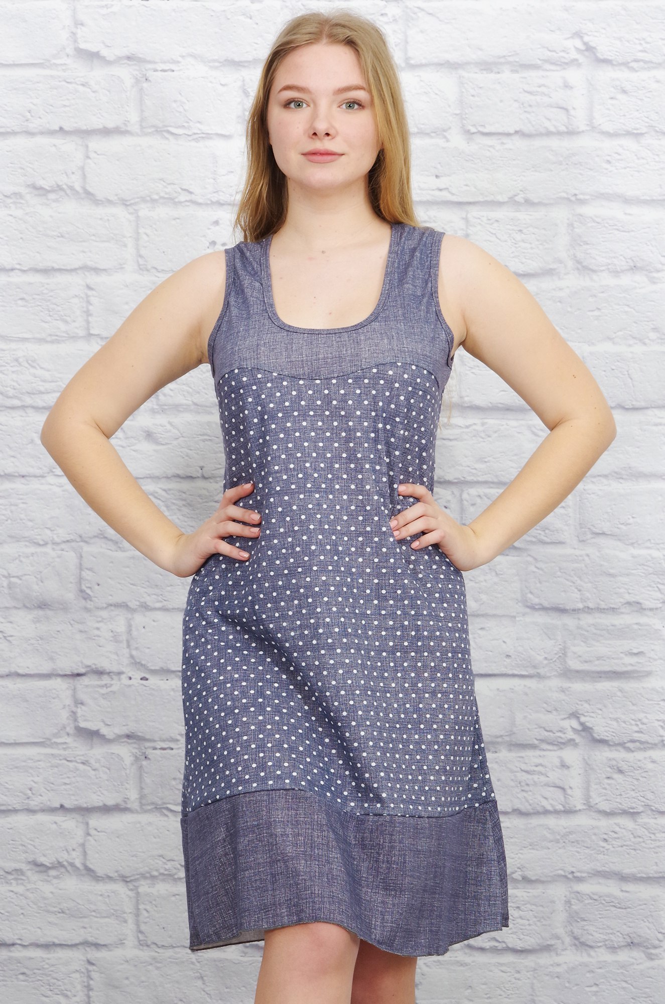 Замечательная недорогая сорочка свободного кроя на широких бретельках с оборкой по низу изделия.