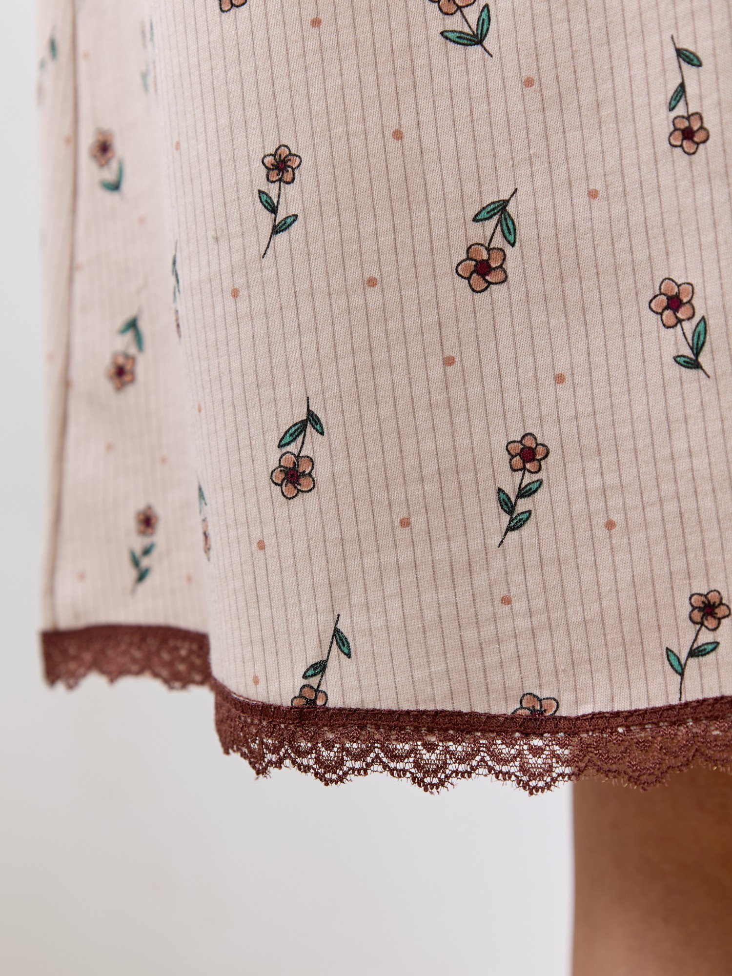 Сорочка женская из трикотажного полотна «кулирка» с набивным рисунком, свободного покроя, с цельнокроеными рукавами и овальным вырезом горловины. Нижние срезы рукавов, горловина, низ изделия отделаны узким кружевом контрастного цвета.