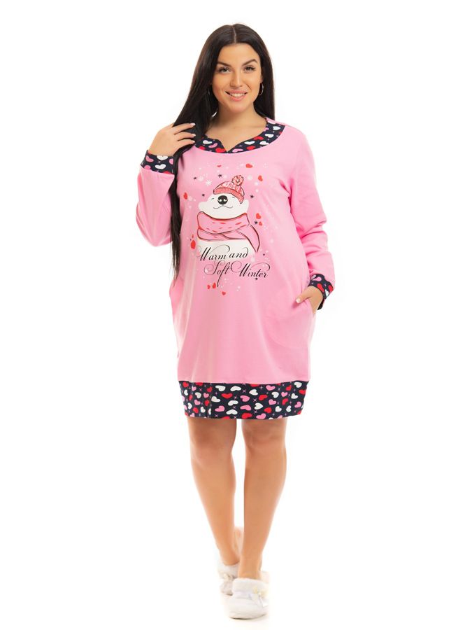 Ткань: футер; Состав: 100% хлопок; Сезонность: зима, весна, осень; Рукав: длинный рукав; Стиль: домашний, молодежный; Праздники: Новый год; Застежка: без застежки; Карман: с карманами; Производство: г. Иваново; Тип изделия: сорочки; Цвет: розовый