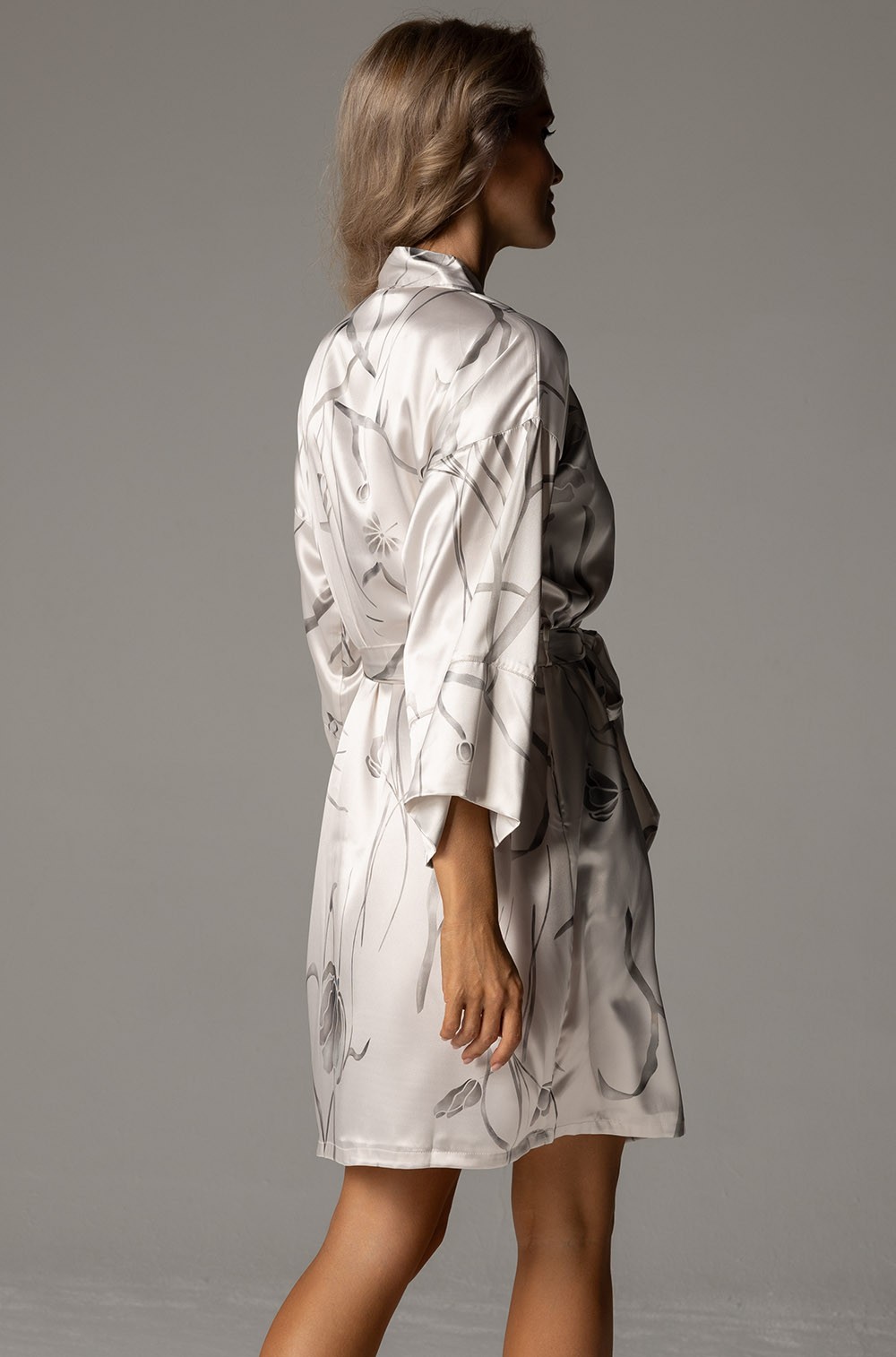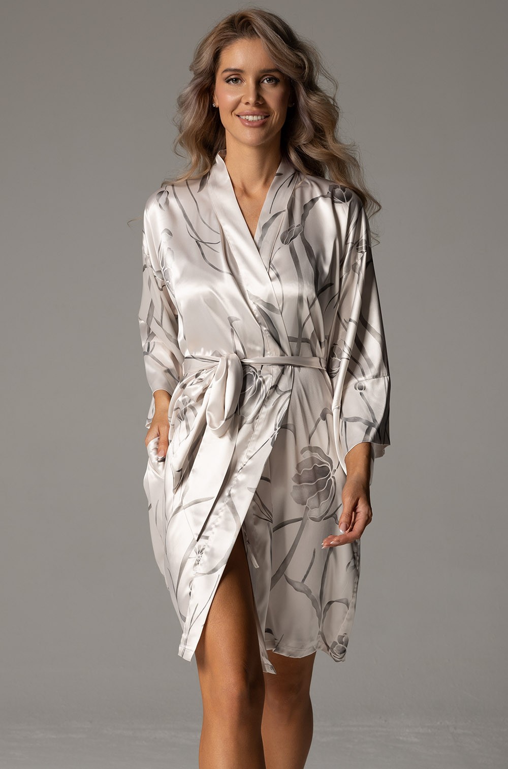 Короткий халат–кимоно Mia-Amore выполнен из принтованного смесового шелка. По бокам расположены карманы. В комплекте идет пояс, чтобы приталить силуэт халата и подчеркнуть элегантный образ.