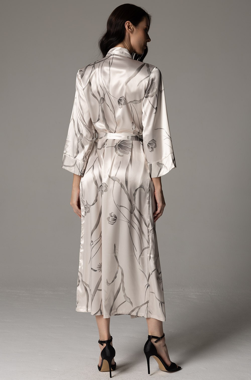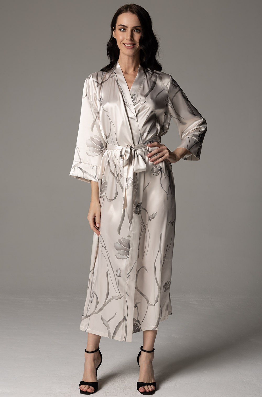 Длинный запашной халат Mia-Amore с широким рукавом. Халат выполнен из принтованного смесового шелка. Борт и манжеты рукавов декорированы тонким контрастным кантом. По бокам изделия обработаны карманы.