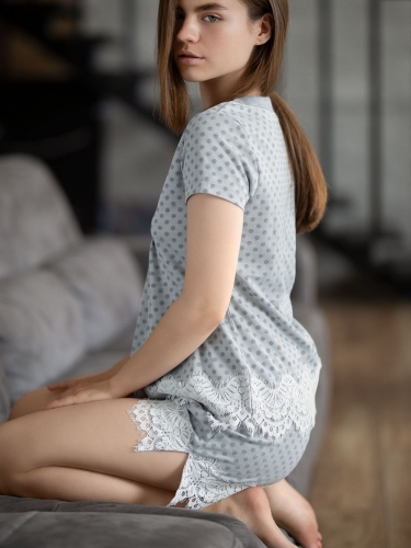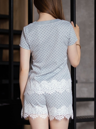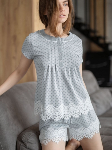 95% полиэстер, 5% спандексЖенский домашний комплект: блуза и шорты из мягкого трикотажа с рисунком «горошек», образованным сочетанием двух оттенков серых нитей. Шорты на резинке, с разрезами по бокам. Низ богато украшен роскошным кружевом. Блуза имеет застежку-планку на пуговицах и застроченные симметричные складочки на груди, которые образуют свободный расслабленный силуэт. Чудесный комплектик!