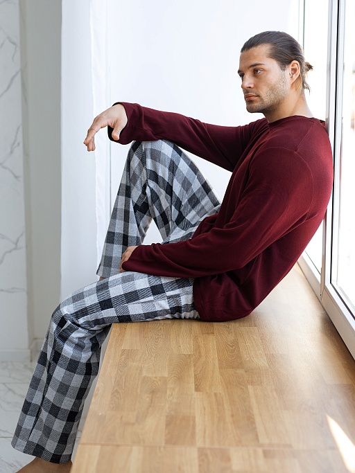 Мужской домашний костюм с брюками и футболкой с длинным рукавом – идеальная одежда для прохладного времени года. Свободные прямые клетчатые брюки из мягкого трикотажа с лёгким ворсом необыкновенно уютны. Пояс на резинке, удобные боковые карманы. Лонгслив выполнен из нежнейшей ткани с содержанием вискозы. Классический силуэт, длинный рукав, округлый вырез горловины, благородные варианты расцветок: винно-красный или цвет индиго – позволяют носить верх от костюма не только дома.