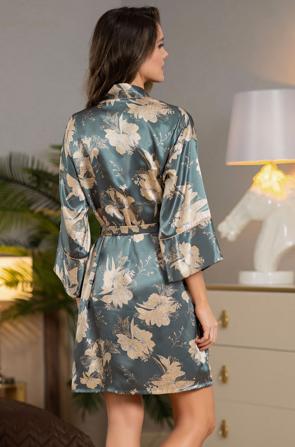 Короткий запашной халат Mia-Amore с рукавами длиной ¾ выполнен из принтованного смесового шелка. Горловина и низ рукавов декорированы кремовым кантом. Комплектуется поясом, в боковых швах кармашки.
