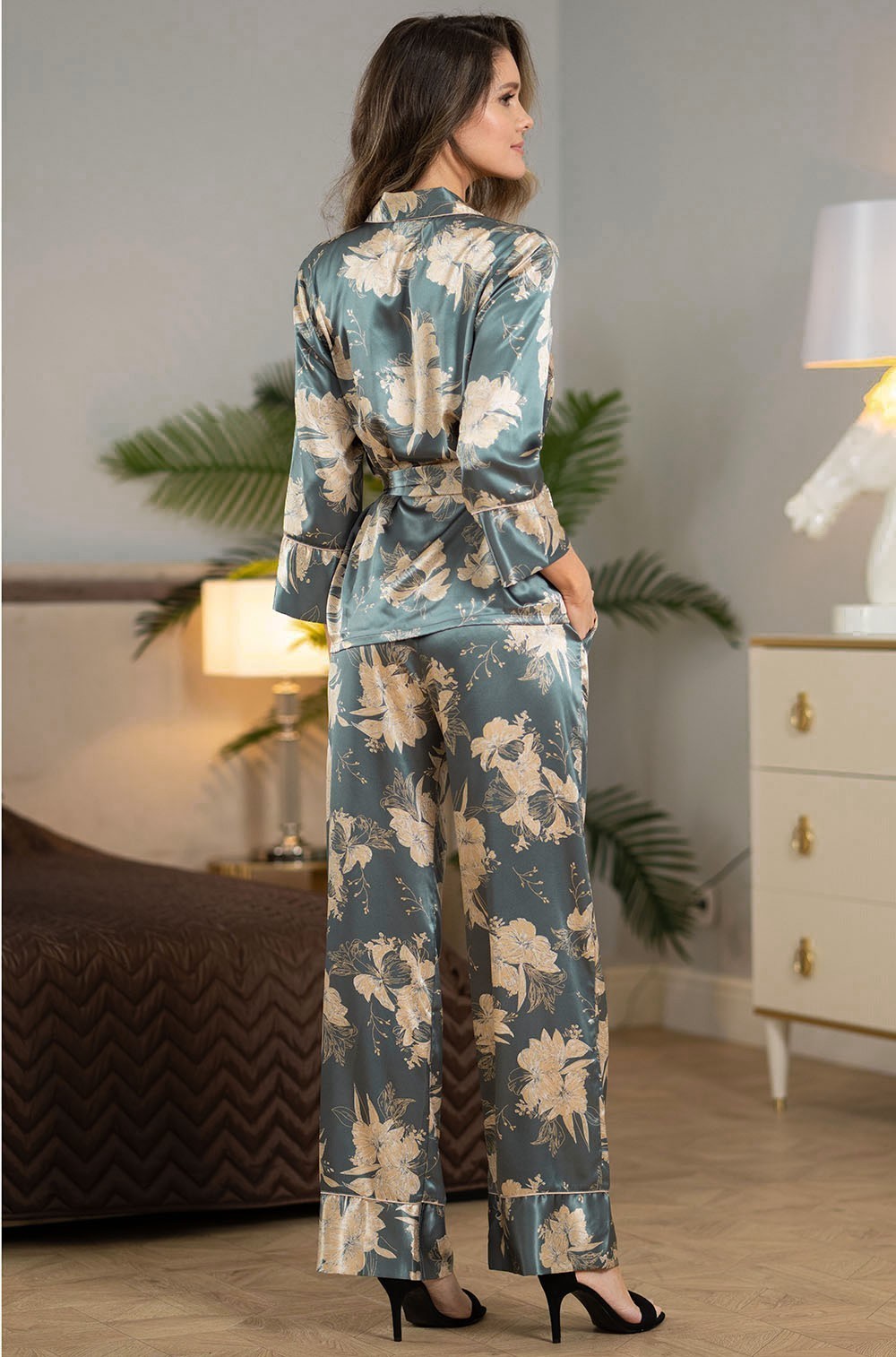 Комплект Mia-Amore состоит из рубашки с рукавами длиной 7/8, с центральной застежкой на пуговицы и брюк, выполнен из принтованного смесового шелка. Борт, воротник, рукава и брюки по низу украшены кремовым кантом. Комплектуется поясом.